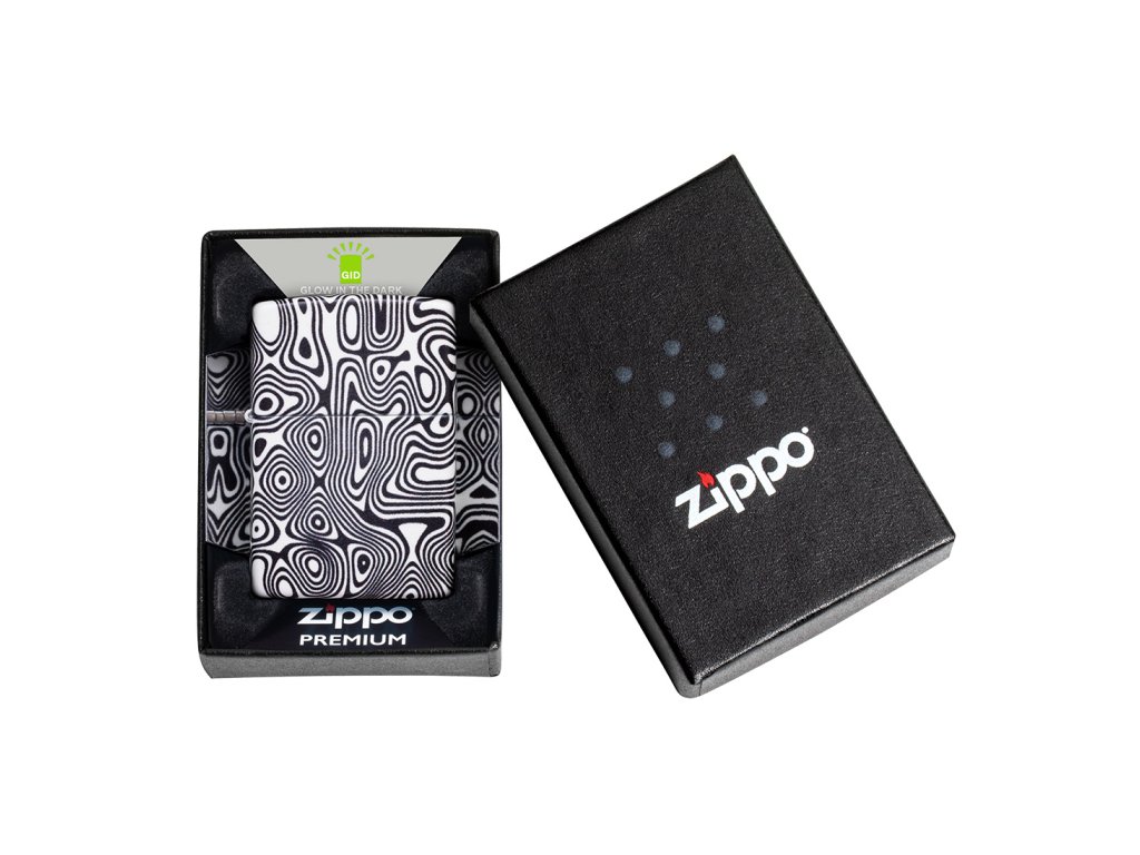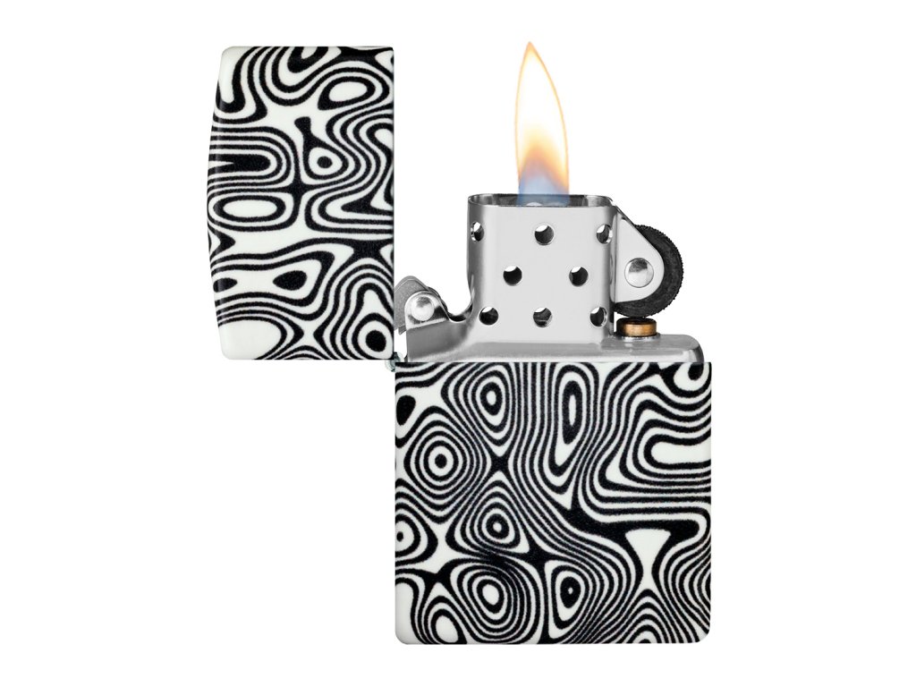 Tento Zippo zapalovač pracuje s plynulým, souvislým motivem vln a spirál, který bez přerušení obepíná celé tělo zapalovače díky technologii 540° Color. Monochromatické barevné pojetí zdůrazňuje rytmus linií a dává vyniknout samotné struktuře grafiky.