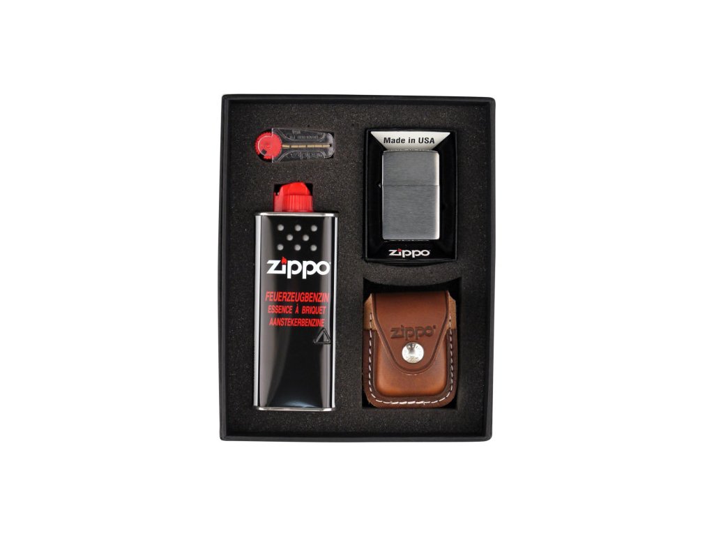 • dárková sada Zippo zapalovače, koženého pouzdra, kamínků, benzínu