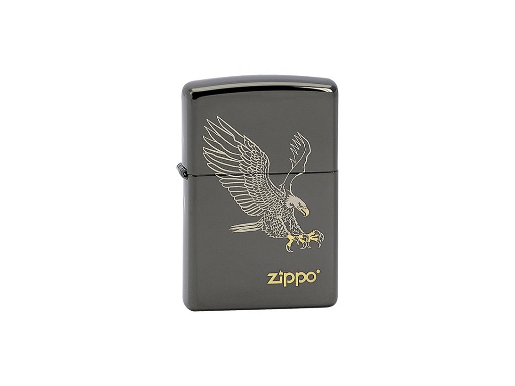 Obrázek přistávajícího Orla bělohlavého na Zippo zapalovači s povrchem Black Ice. Zapalovač je větruodolný v kryt doživotní zárukou.