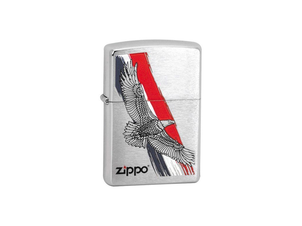 Zapalovač Zippo zdobený potiskem s Orlem bělohlavým. Zapalovač je z horizontálně broušeného chromu, velmi odolná povrchová úprava.