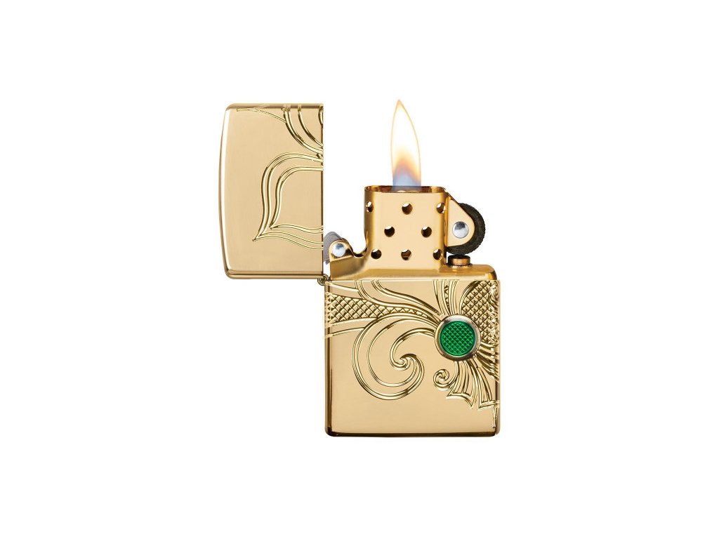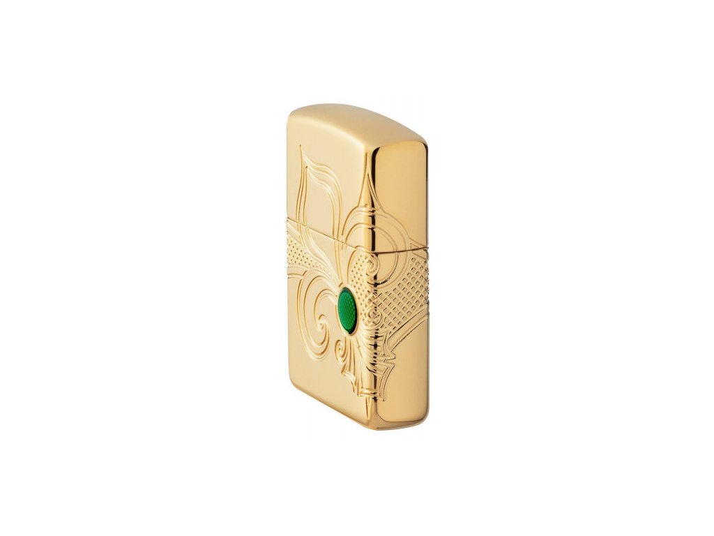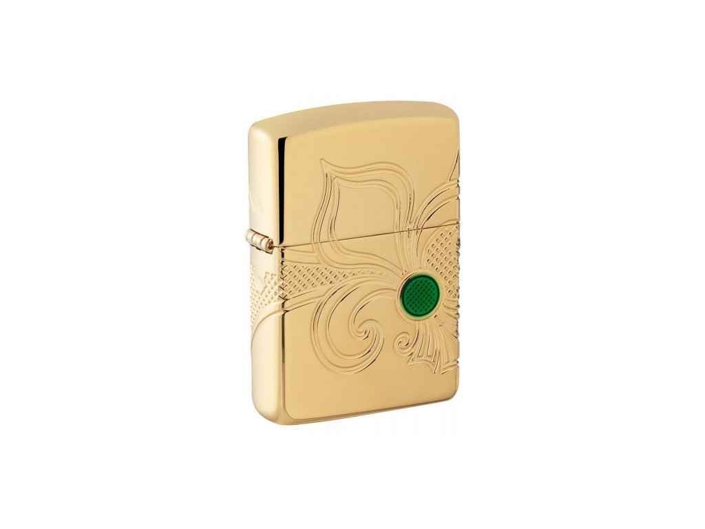 Pozlacený Zippo zapalovač z řady Armor. Zapalovač zdobí motiv lilie s detaily z epoxidové pryskyřice. Luxusní Zippo zapalovač.