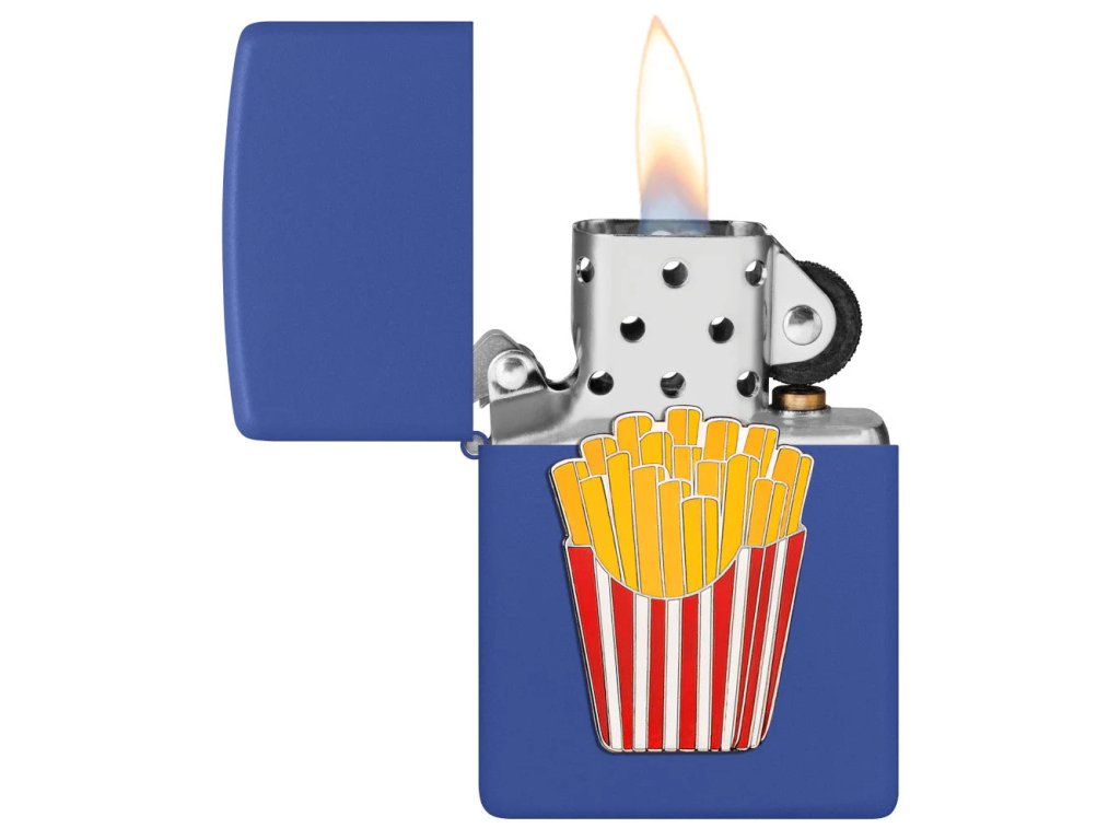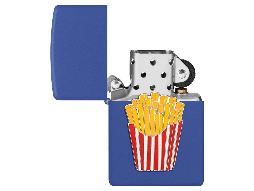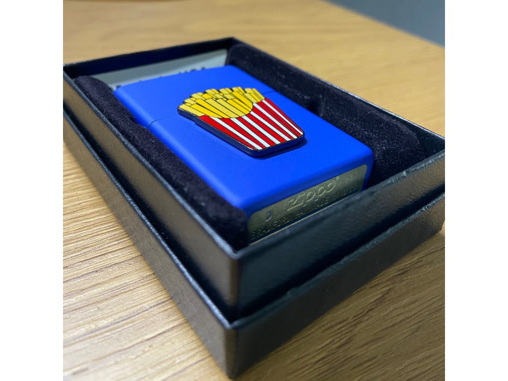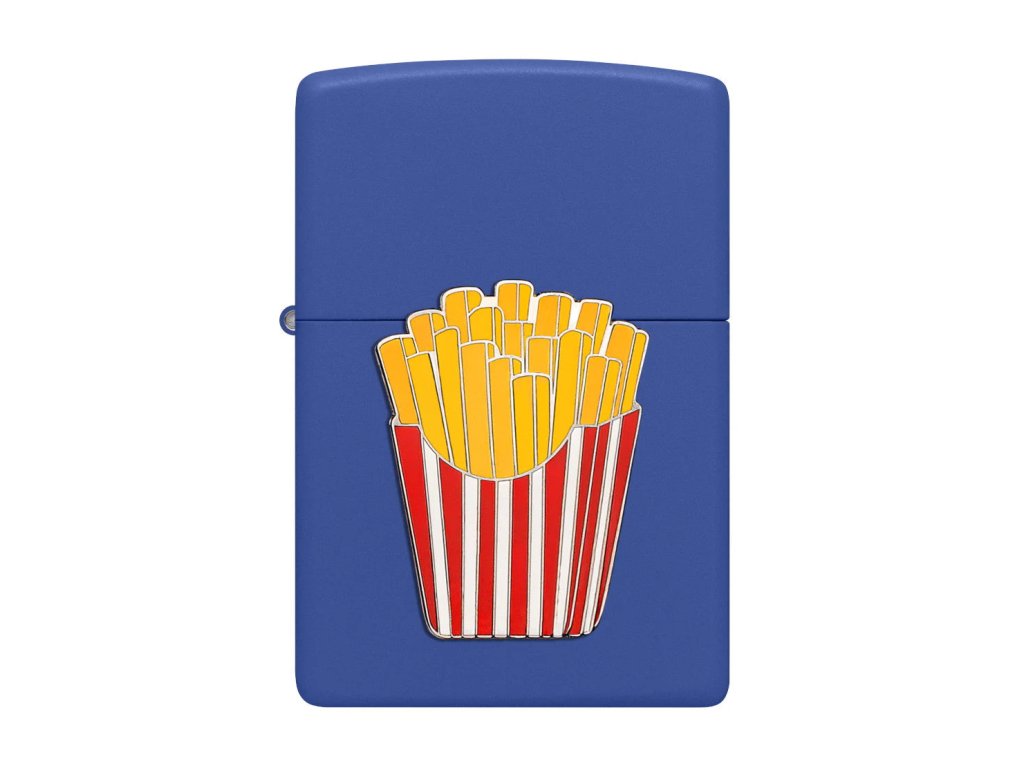 Křupavé, zlatavé hranolky, které přímo vybízejí k zakousnutí – právě ty zdobí tento stylový Zippo zapalovač v matné královsky modré barvě. Výrazný 3D motiv z kovu a smaltu vystupuje z povrchu zapalovače a zachovává si svůj tvar i při otevření víčka.