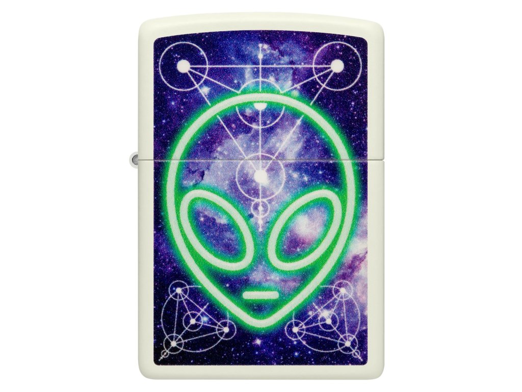 Nechte se vtáhnout do tajemného světa vesmíru. Tento klasický Zippo zapalovač nabízí Glow-in-the-Dark efekt, který ve tmě zvýrazní detailní Color Image motiv – svítící mimozemskou hlavu na galaktickém pozadí.