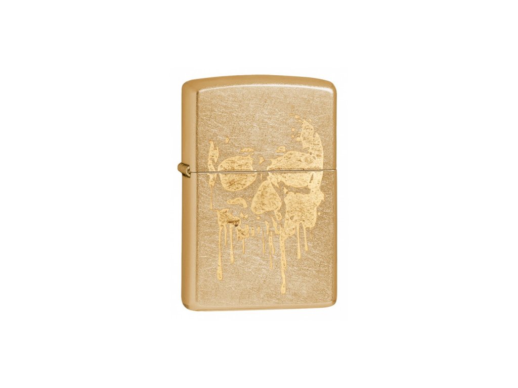 Zlatým prachem pozlacený zapalovač Zippo s leptaným motivem lebky na přední straně. Originál Zippo Made in USA.