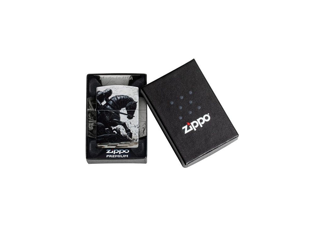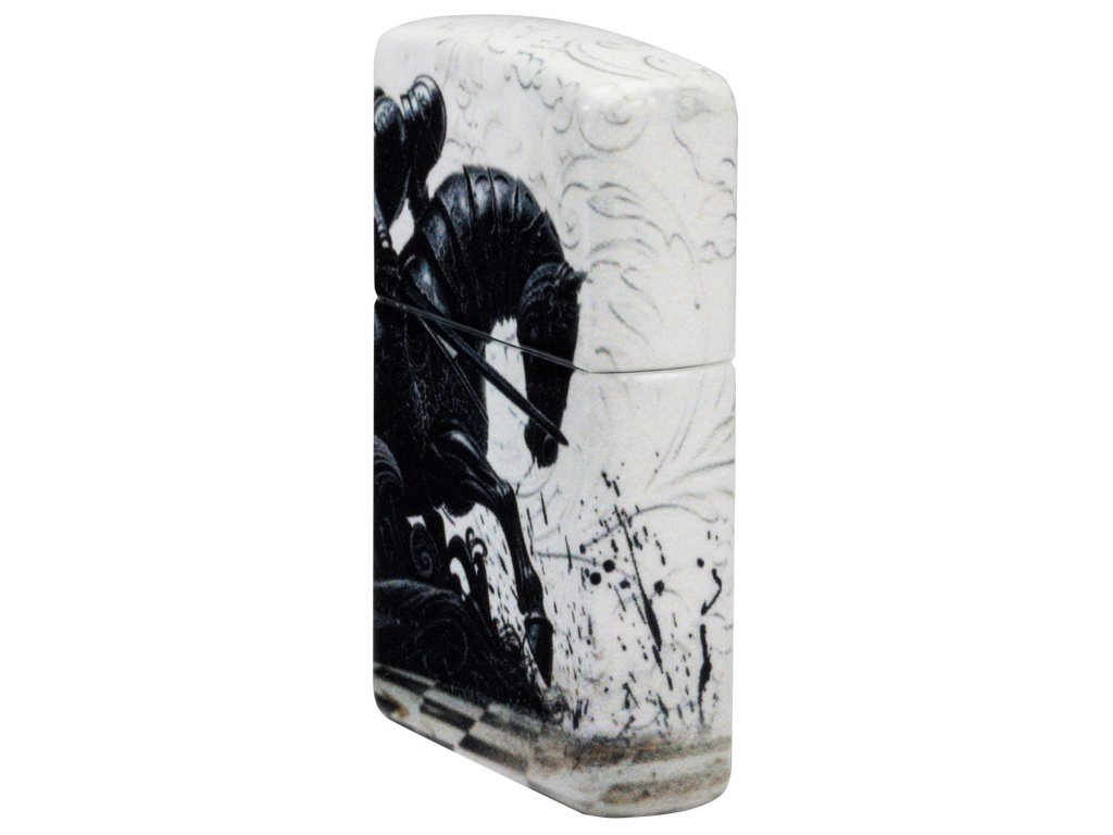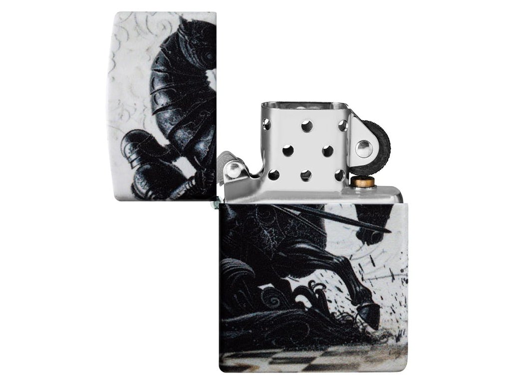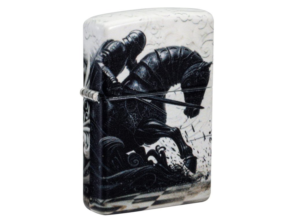 Zippo zapaľovač s motívom rytiera je ideálny pre milovníkov histórie, umenia a zberateľov originálnych dizajnov. Na matnej čiernej báze 540 Matte sa nachádza fascinujúca grafika rytiera jazdiaceho na koni po šachovnici – čierne a temné zviera kontrastuje s bielym a priateľským, symbolizujúc večný boj dobra so zlom. Dizajn pripomína atmosféru dávnych rytierskych turnajov a vďaka technológii 540 Color je zobrazený prakticky na všetkých štyroch stranách zapaľovača aj na viečku, takže motív pôsobí nekonečne.