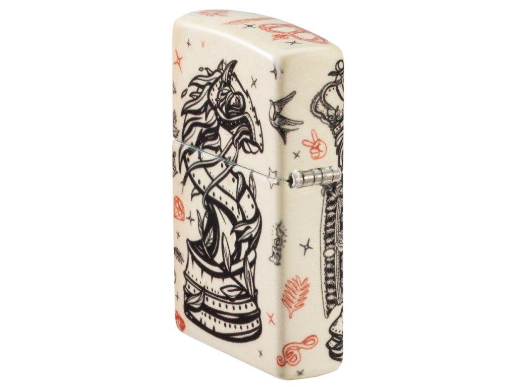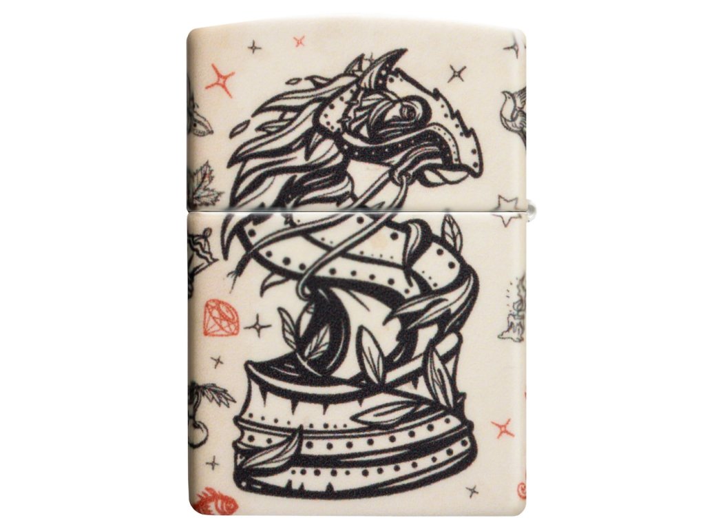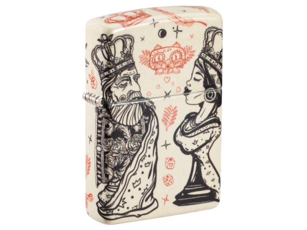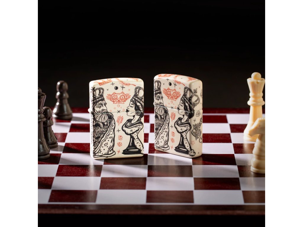 Tento jedinečný Zippo zapaľovač s technológiou 540 Color premení šachovú hru na umelecké dielo. Kráľ a kráľovná si vymieňajú pohľady, zatiaľ čo figúra koňa bdie nad fantastickým motívom plným detailov. Odolná kovová konštrukcia a vetruvzdorný dizajn zaisťujú spoľahlivosť za každého počasia. Doživotná záruka a ikonické "cvaknutie" viečka robia z tohto Zippo zapaľovača nadčasový doplnok. Pre najlepší výkon odporúčame originálne Zippo palivo, kamienky a knôt.