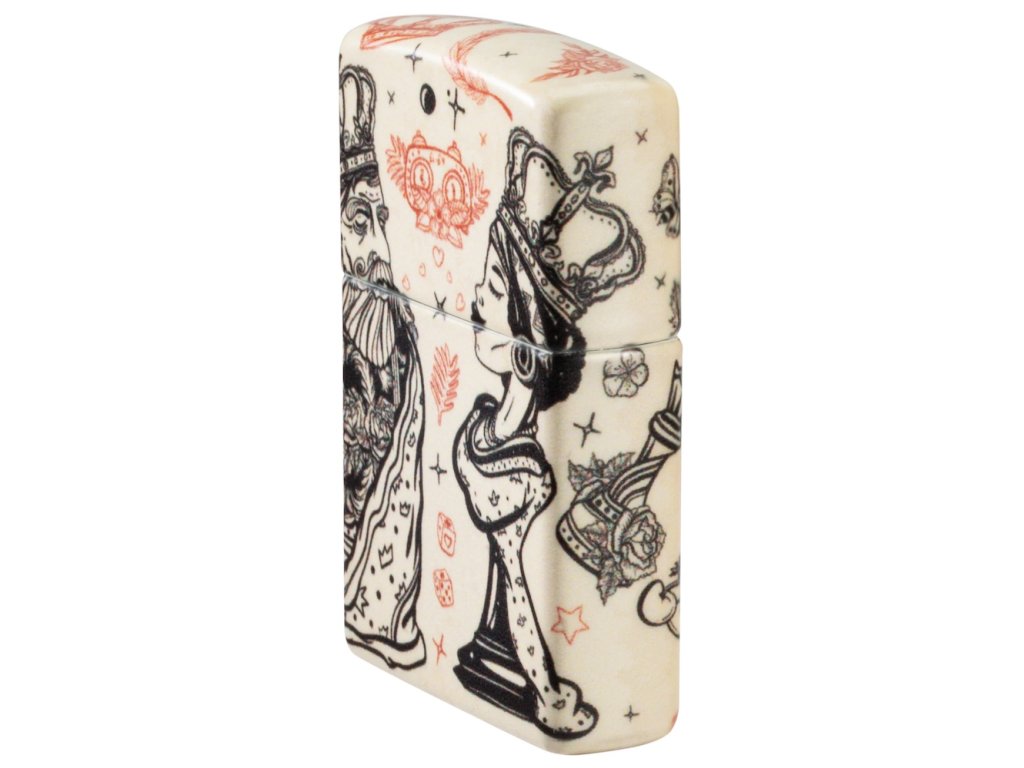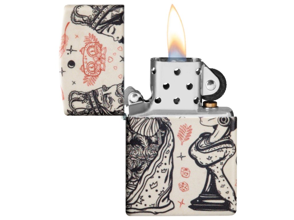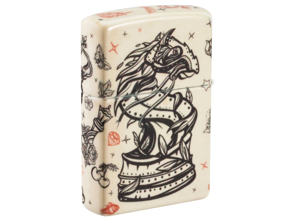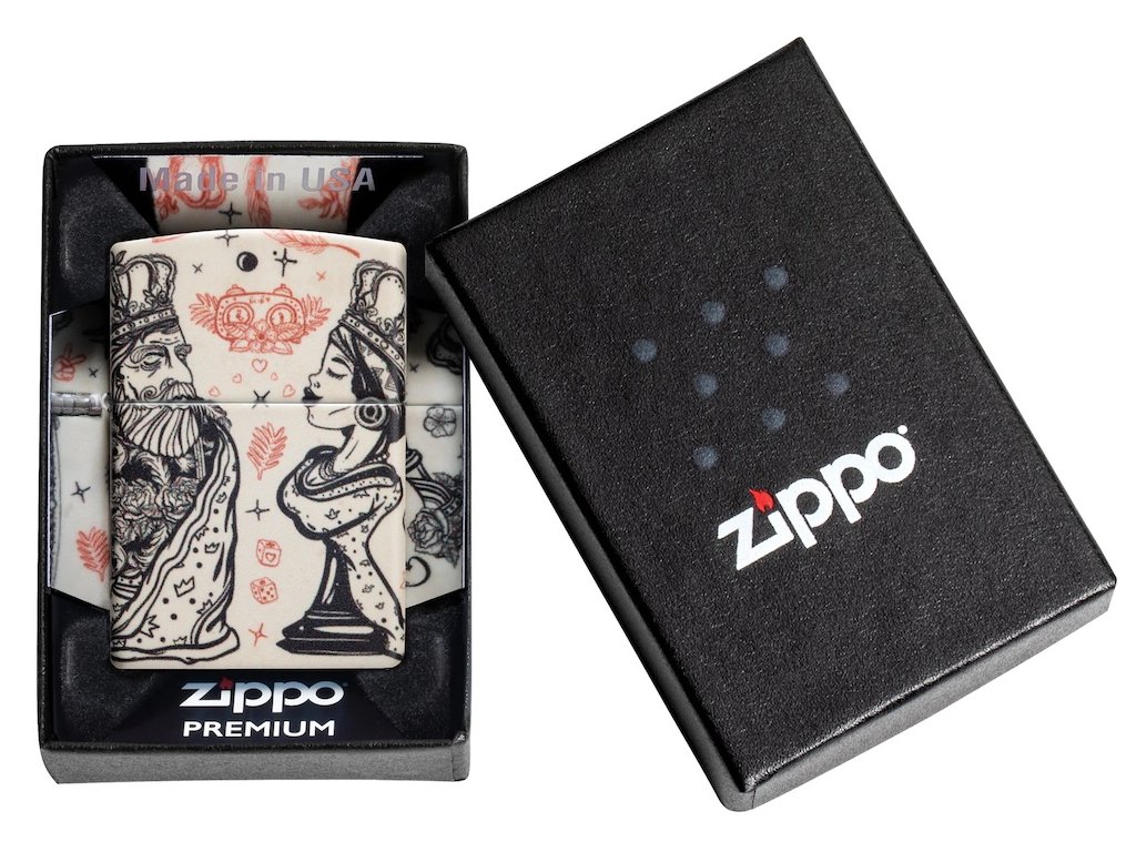 Tento jedinečný Zippo zapaľovač s technológiou 540 Color premení šachovú hru na umelecké dielo. Kráľ a kráľovná si vymieňajú pohľady, zatiaľ čo figúra koňa bdie nad fantastickým motívom plným detailov. Odolná kovová konštrukcia a vetruvzdorný dizajn zaisťujú spoľahlivosť za každého počasia. Doživotná záruka a ikonické "cvaknutie" viečka robia z tohto Zippo zapaľovača nadčasový doplnok. Pre najlepší výkon odporúčame originálne Zippo palivo, kamienky a knôt.