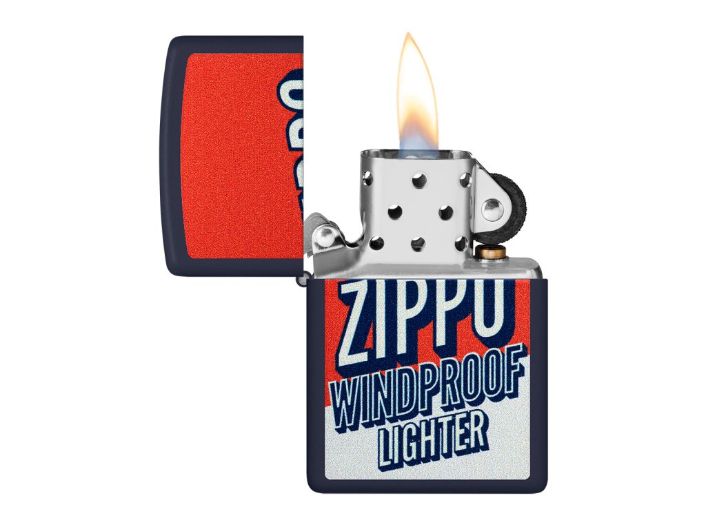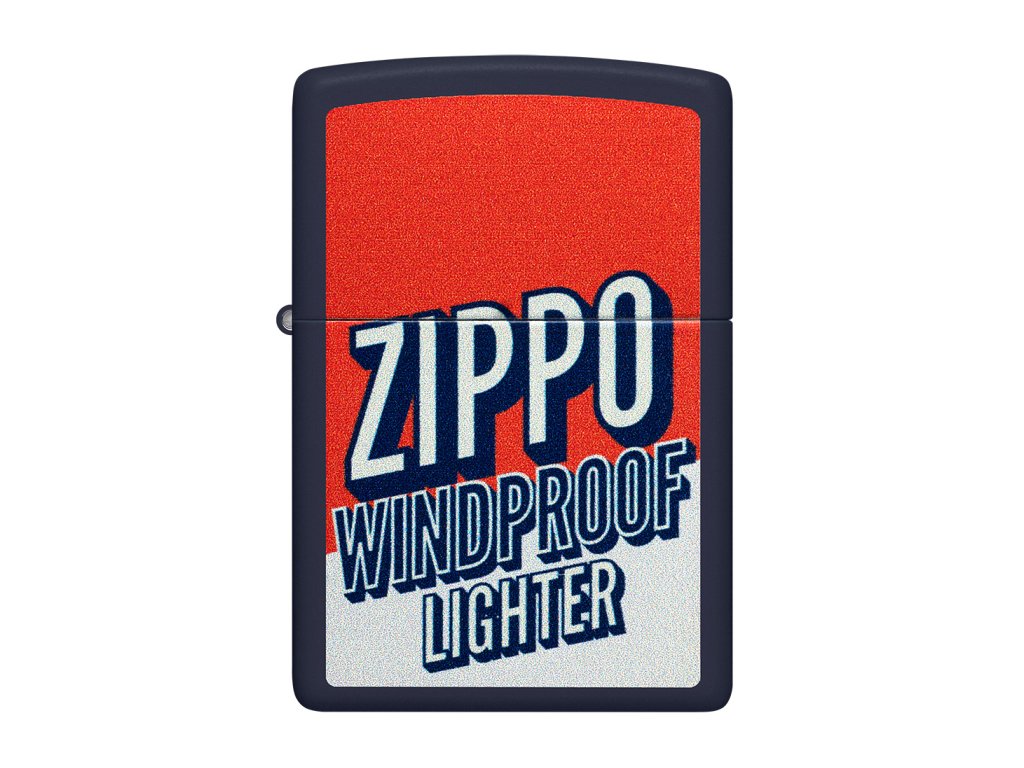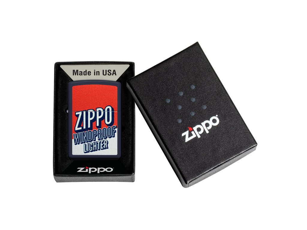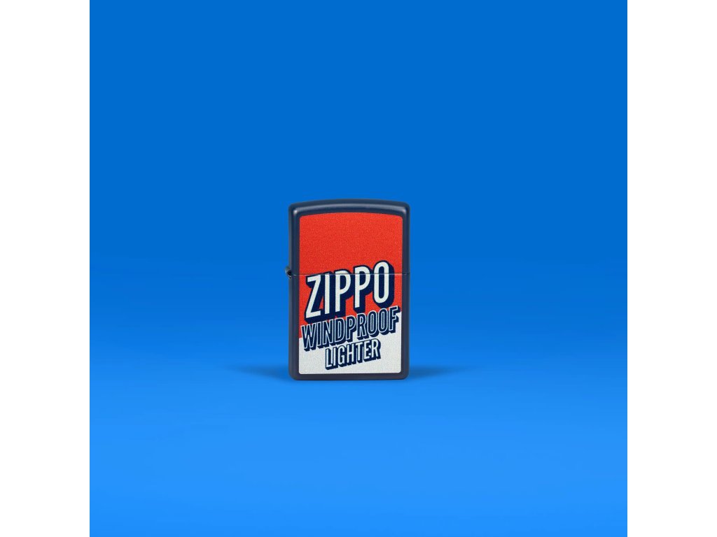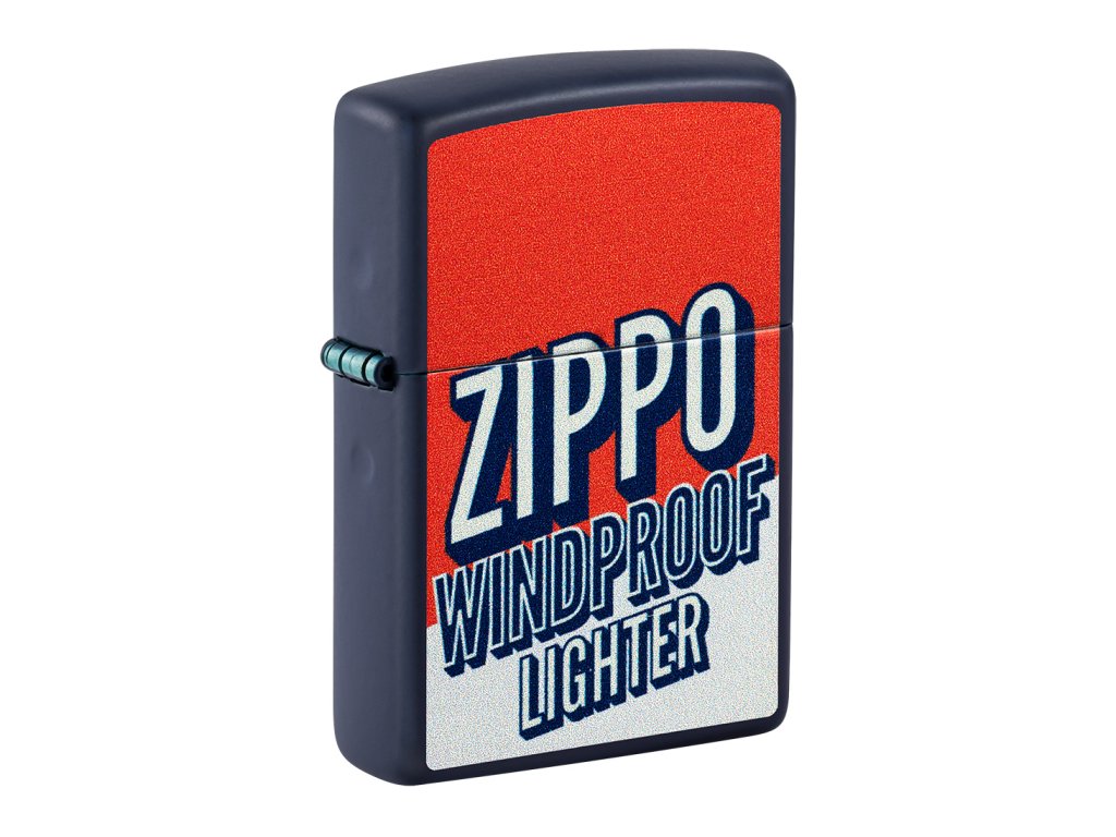 Na matnom povrchu v námornej modrej vyniká výrazný nápis „Zippo Windproof Lighter“ v blokovom štýle, vytvorený technológiou Color Image. Tento zapaľovač kombinuje ikonický dizajn s praktickosťou a je dodávaný v elegantnej darčekovej krabičke.