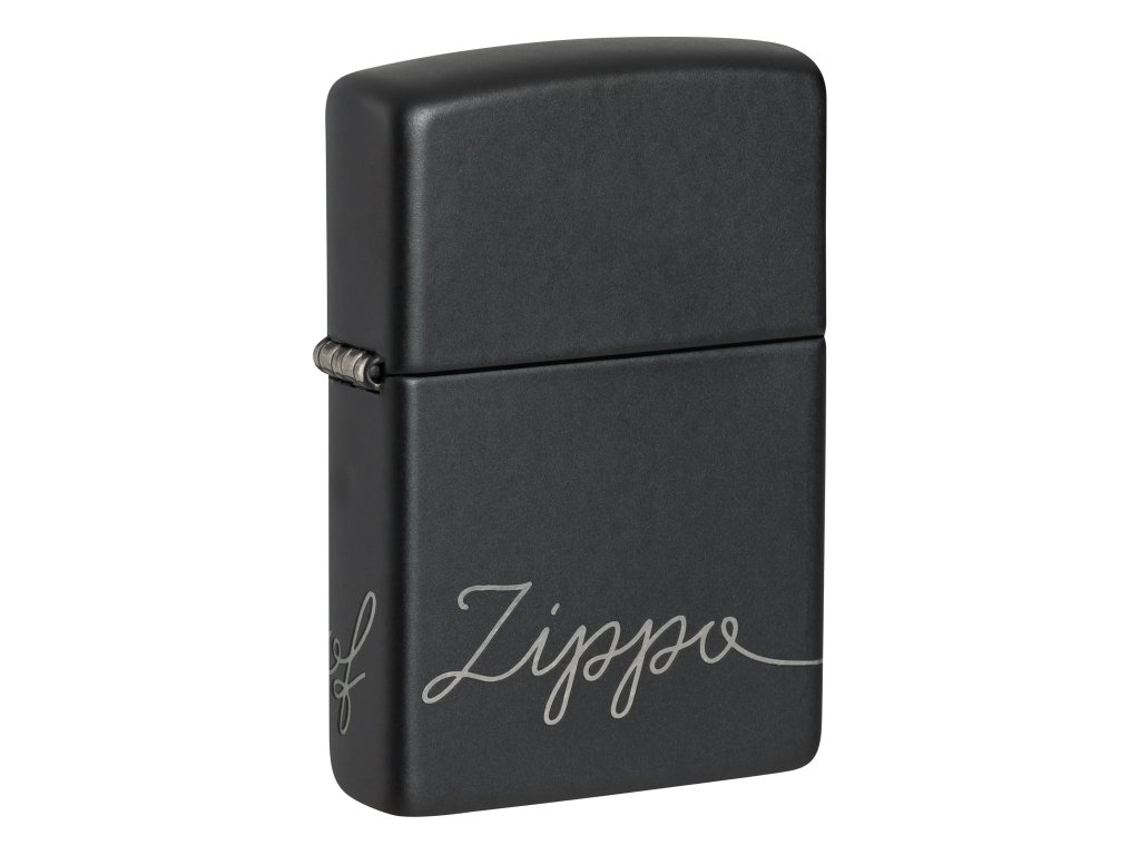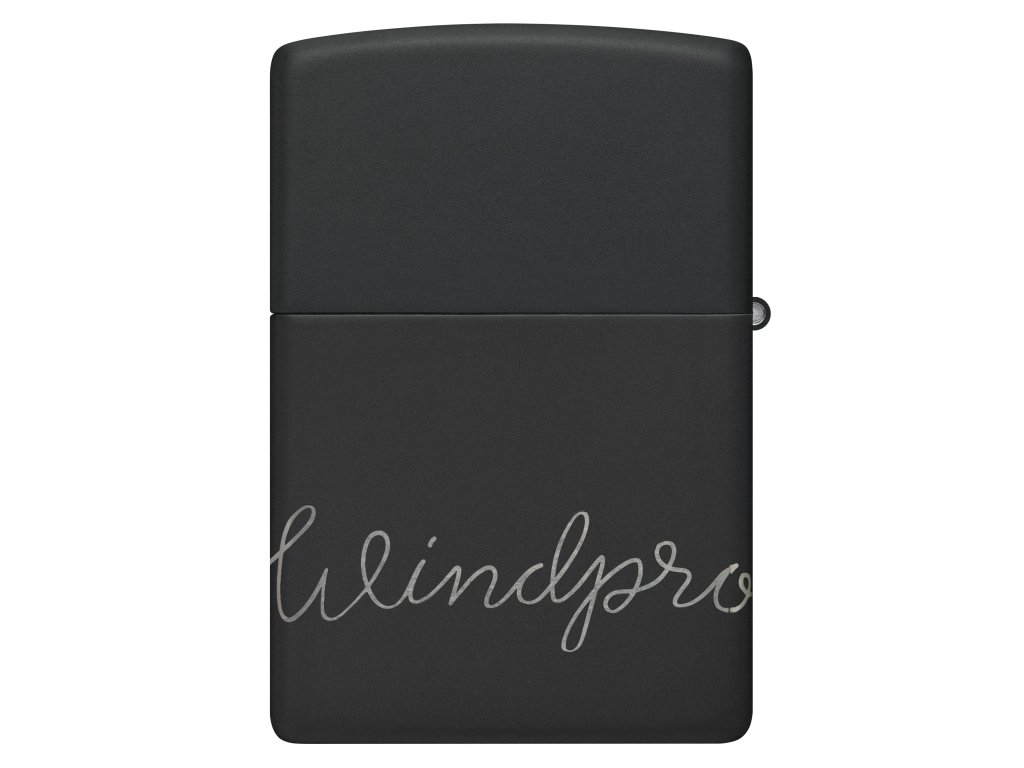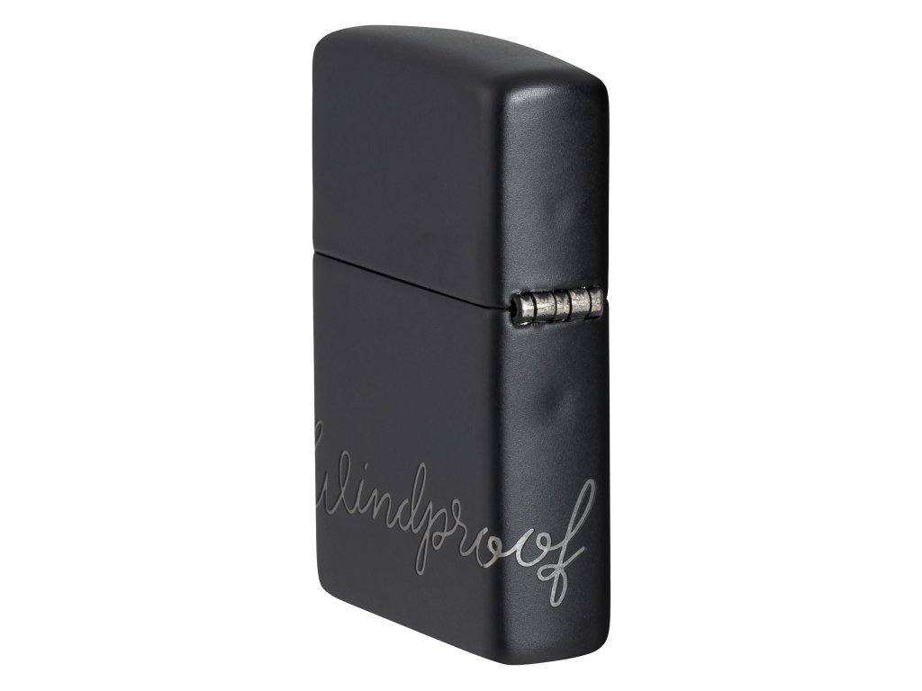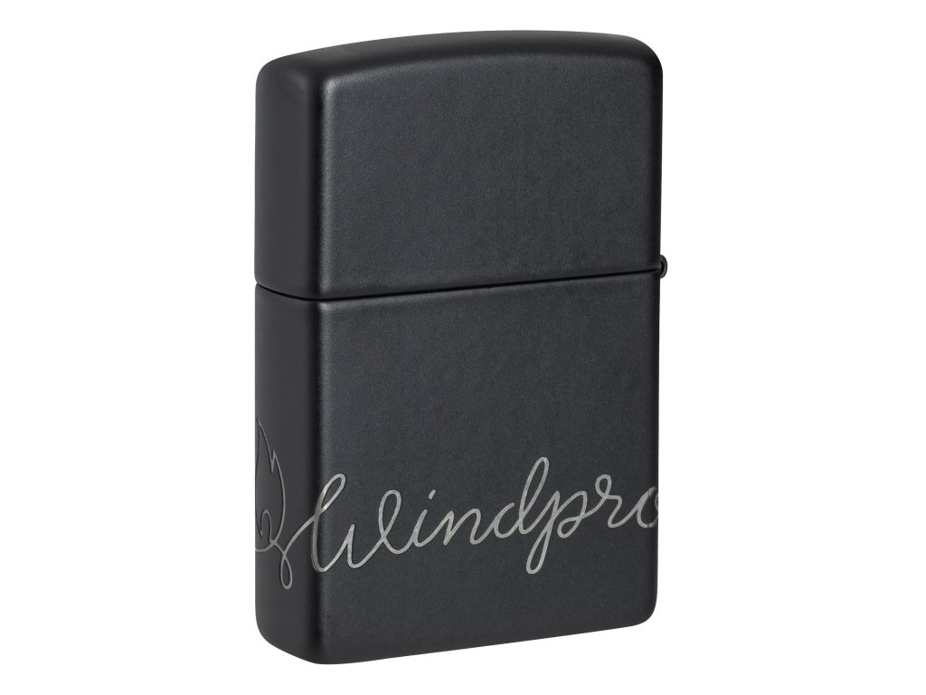 Tento klasický matný čierny zapaľovač nesie nápisy „Zippo“ a „Windproof“ elegantným písacím písmom, vytvoreným plynulým gravírovaním aj cez hrany a boky zapaľovača technikou 360° Laser.