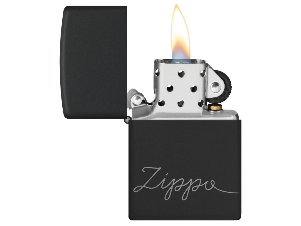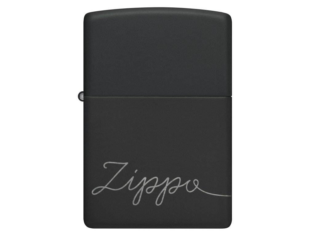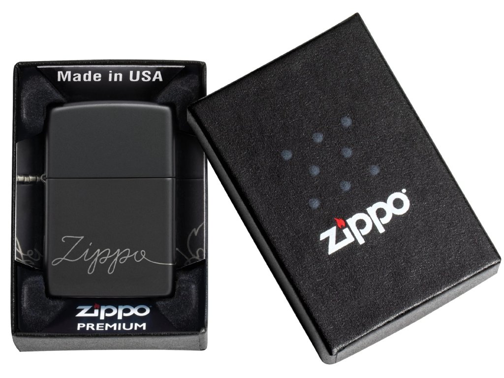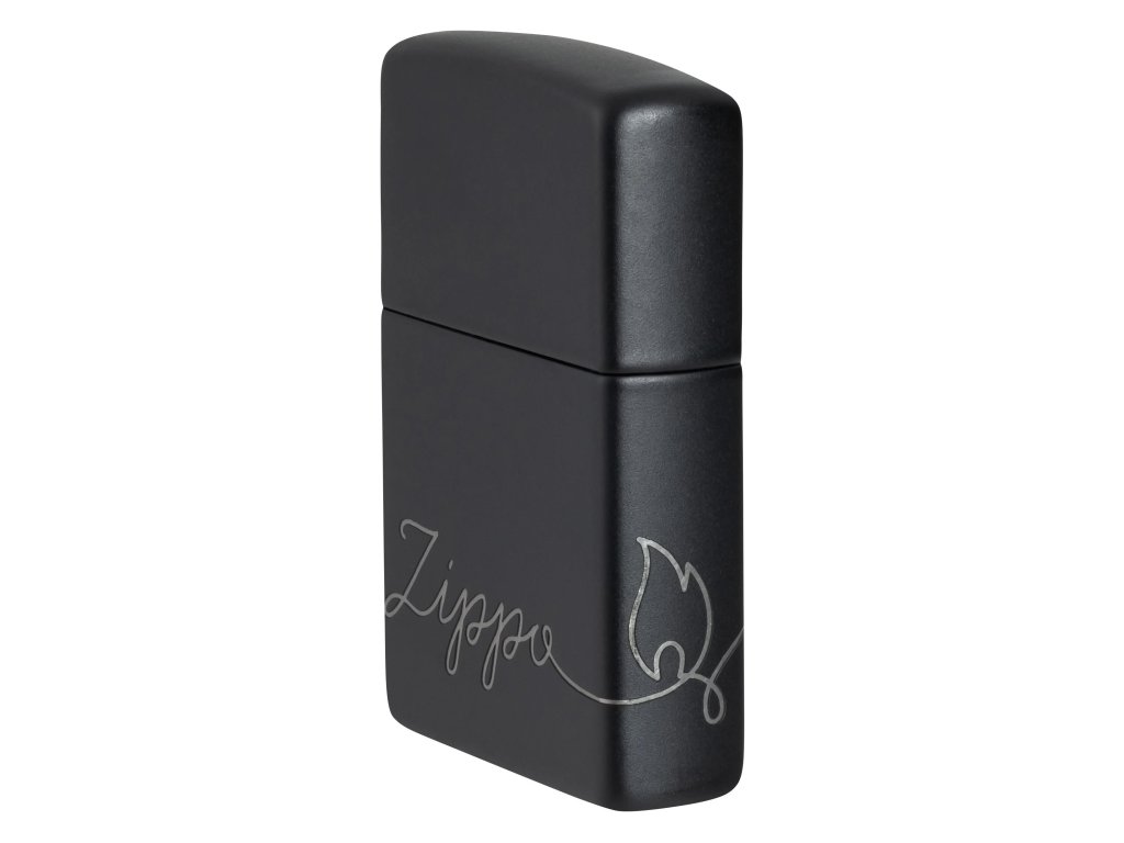 Tento klasický matný čierny zapaľovač nesie nápisy „Zippo“ a „Windproof“ elegantným písacím písmom, vytvoreným plynulým gravírovaním aj cez hrany a boky zapaľovača technikou 360° Laser.