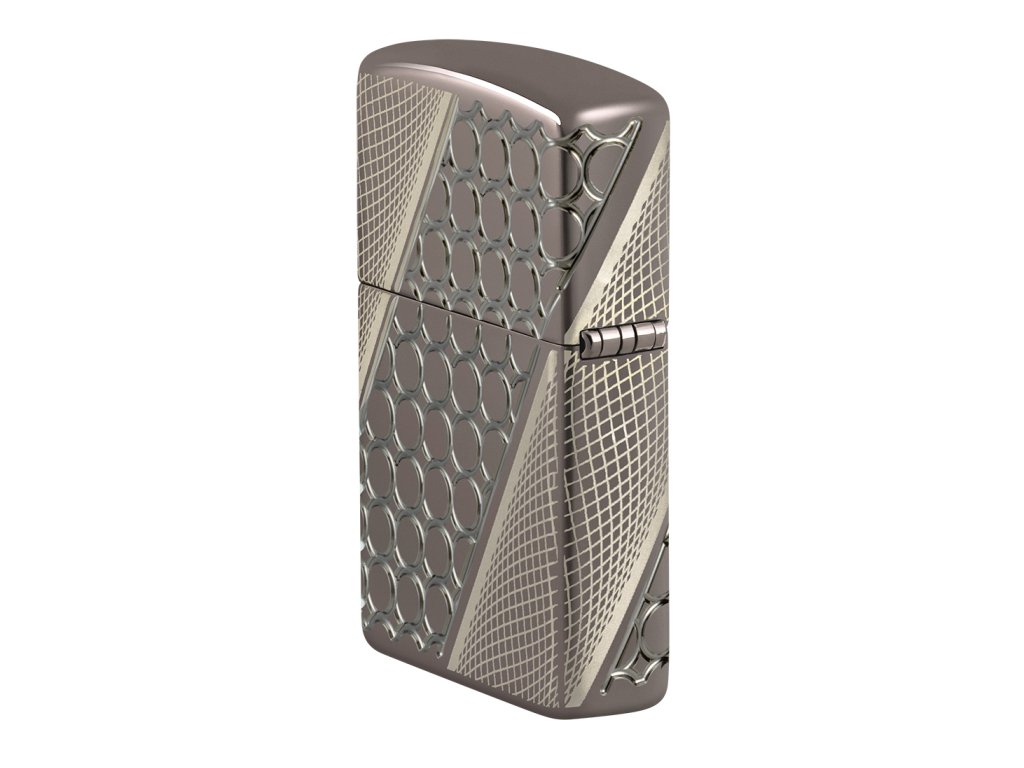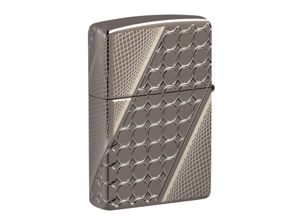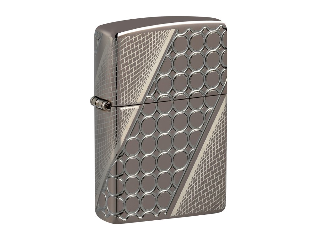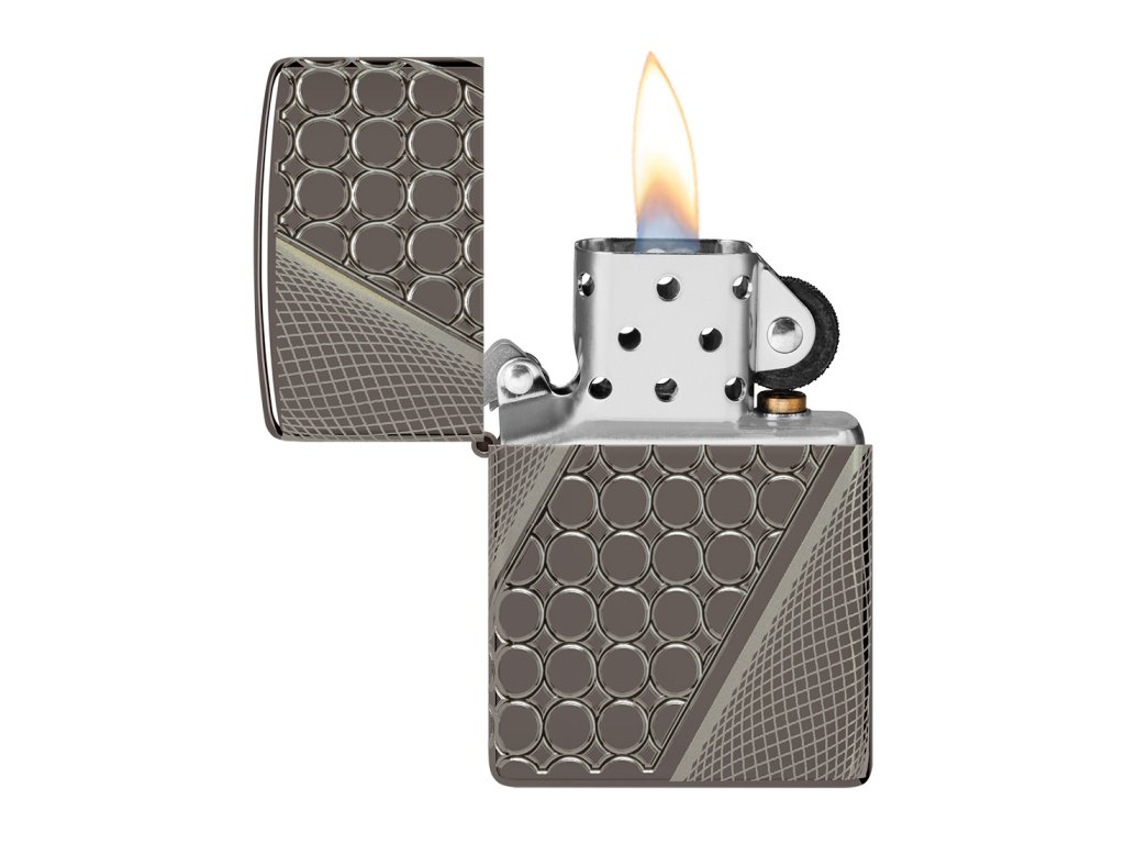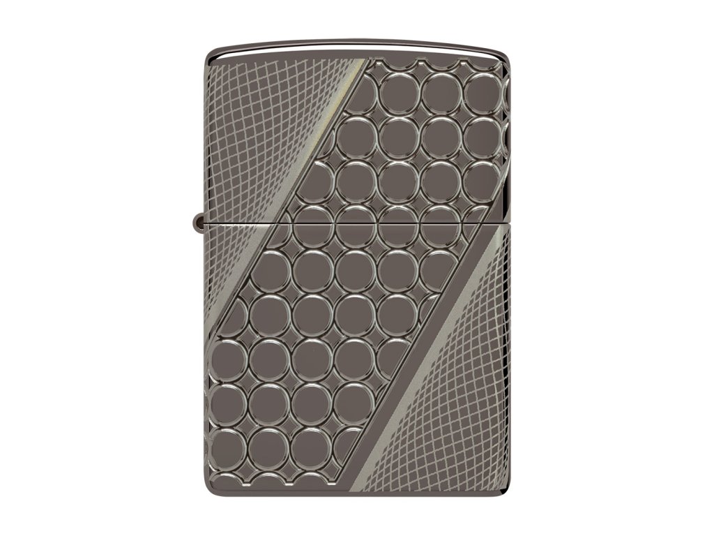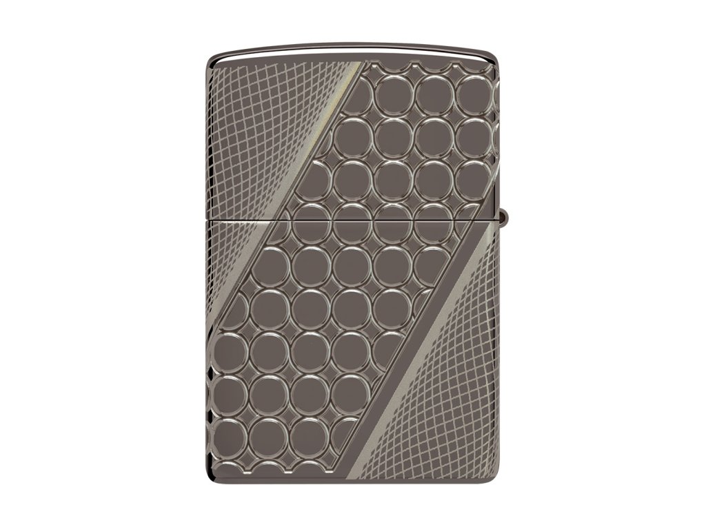 Prémiový Zippo zapaľovač Armor® Black Ice® spája dve pokročilé technológie zdobenia – 360° MultiCut s hlbokým viacosovým frézovaním a Photo Image 360° pre detailnú celoplošnú kovovú tlač. Prednú aj zadnú stranu tvorí elegantný pás vyfrézovaných bodiek doplnený jemnou grafickou maticou. Zapaľovač je balený v darčekovej krabičke a vzťahuje sa naň doživotná záruka.