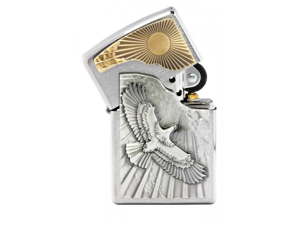 Americký orol letí v ústrety žiariacemu slnku na netradičnom embléme tohto Zippo zapaľovača. Vetruodolný benzínový zapaľovač s doživotnou zárukou.
