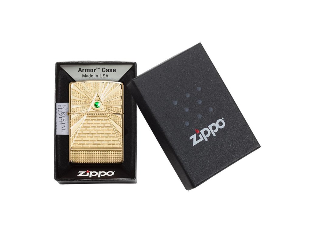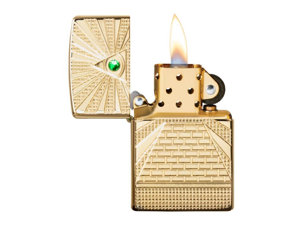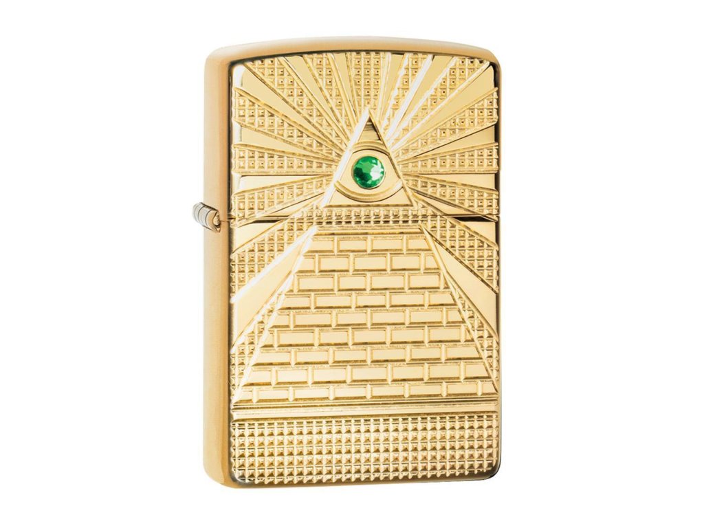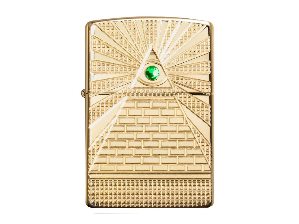 Tento exkluzívny Armor® High Polish Brass zapaľovač prináša mystický motív Eye of Providence – vševediaceho oka, symbolizujúceho božskú prozreteľnosť a ochranu. Hlboké gravírovanie pyramídy s zeleným kryštálom Swarovski uprostred dodáva zapaľovaču tajomný a očarujúci vzhľad.