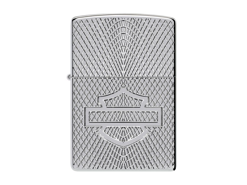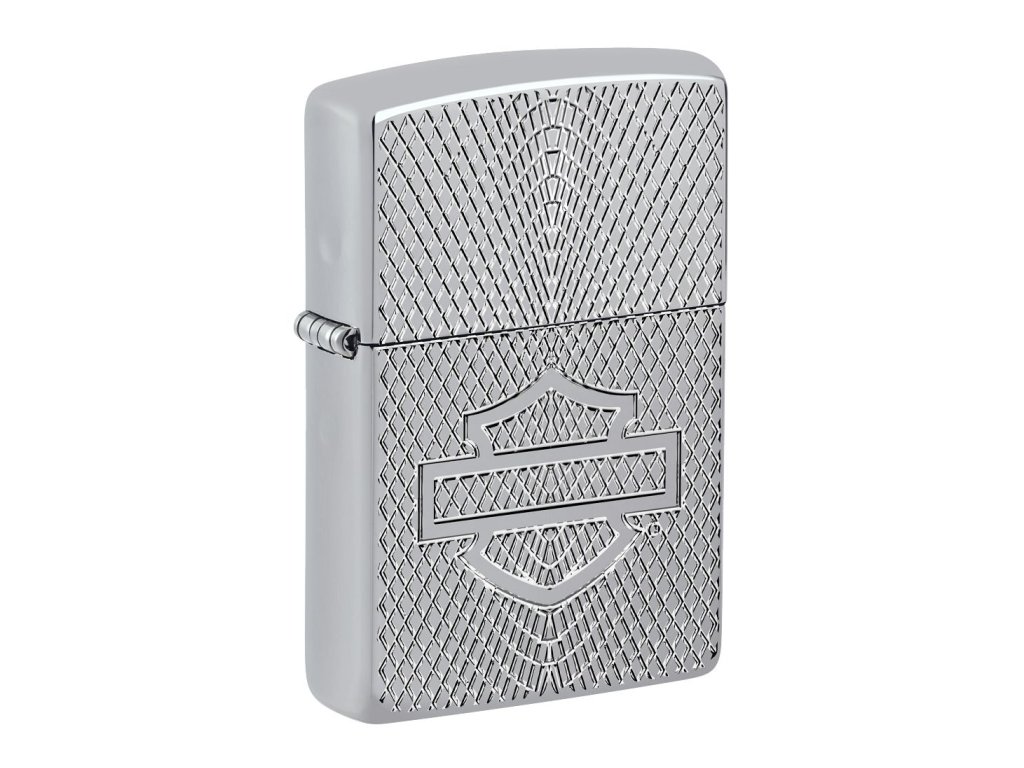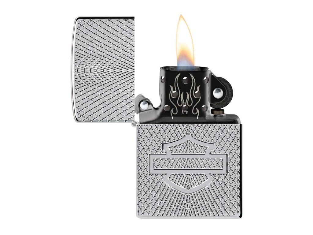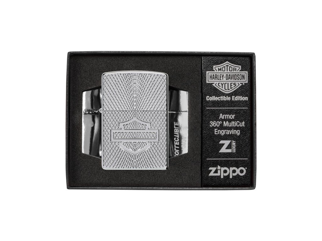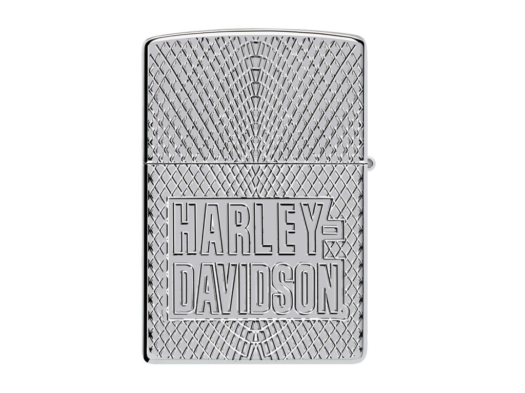 Zapaľovač sa pýši žiarivým povrchom High Polish Chrome a ikonickým logom Harley-Davidson® na prednej strane. Zadná strana je zdobená nápisom Harley-Davidson® prevedeným luxusným hlbokým frézovaním Deep Carve. Vnútri sa nachádza čierno potiahnutý oceľový insert s jemne laserovaným plameňom, čo dodáva tomuto modelu výrazný estetický vzhľad a zároveň punc exkluzivity.