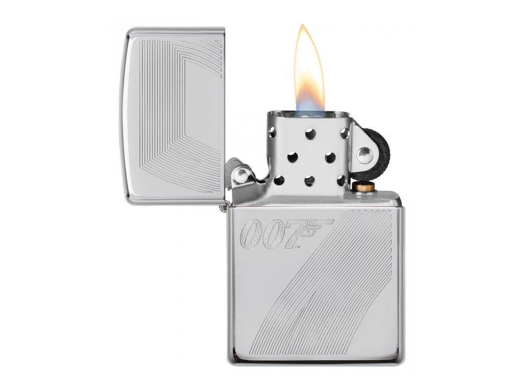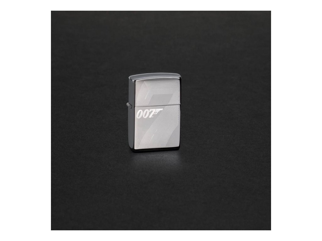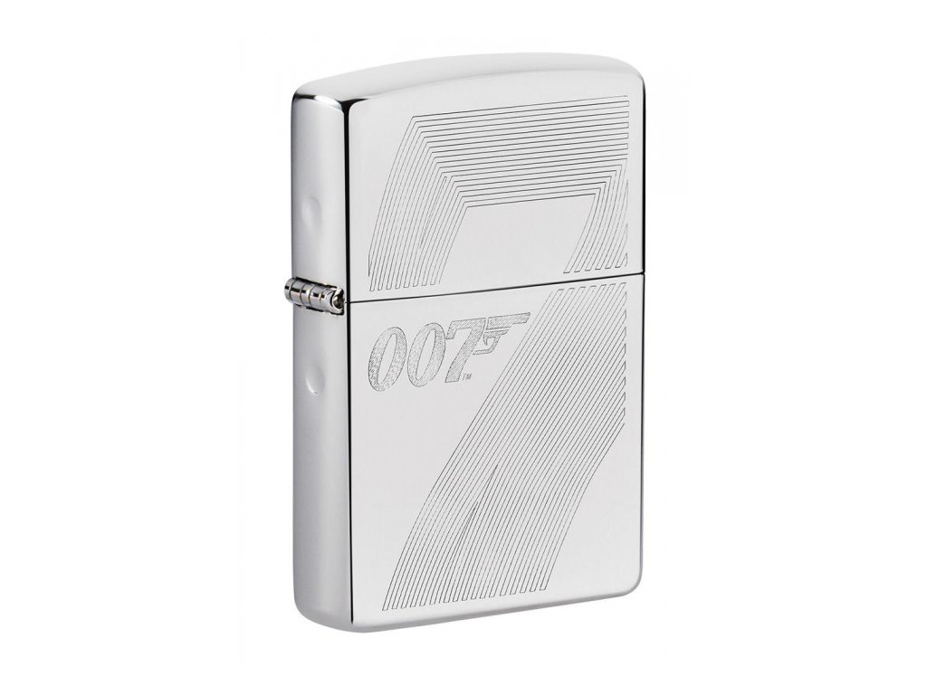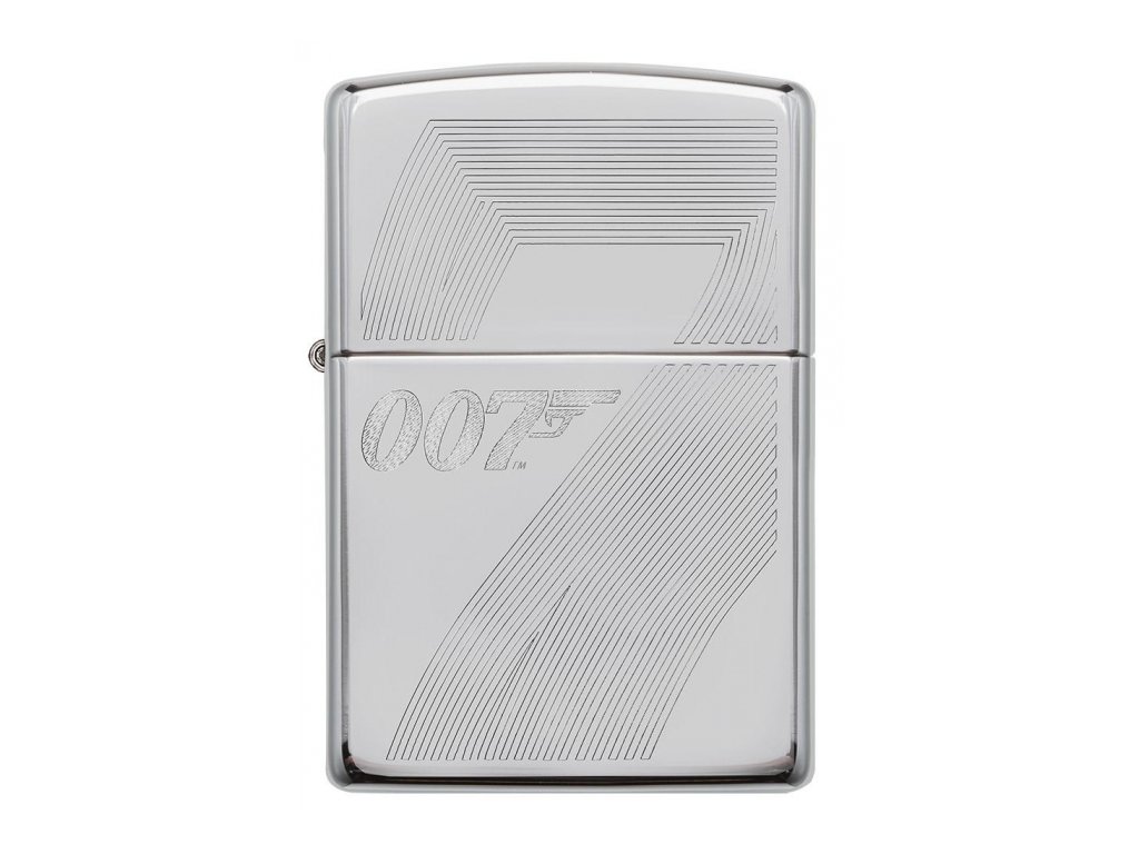 Zippo James Bond. Benzínový zapaľovač s povrchom z lešteného chrómu, ktorý je zdobený ikonickou číslovkou 007. Zapaľovač je dodávaný v darčekovej krabičke.