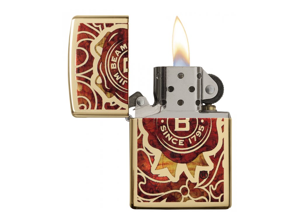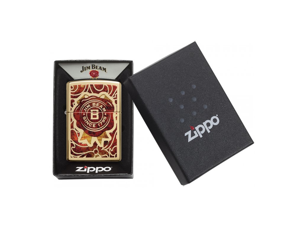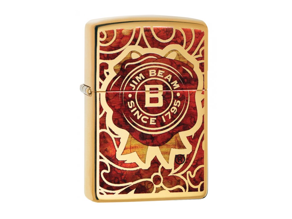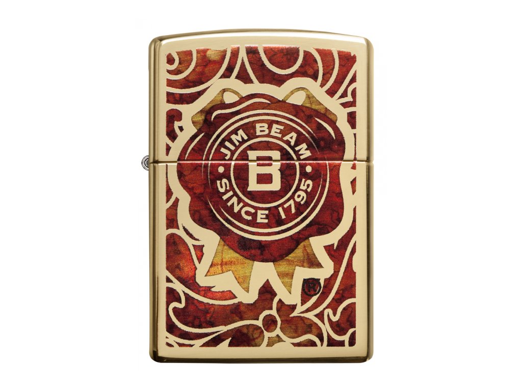 Zippo zapaľovač z leštenej mosadze a s veľkým logom Jim Beam, ktoré je na prednej strane vyvedené technikou Fusion, napodobňujúce vzhľad vitráže.