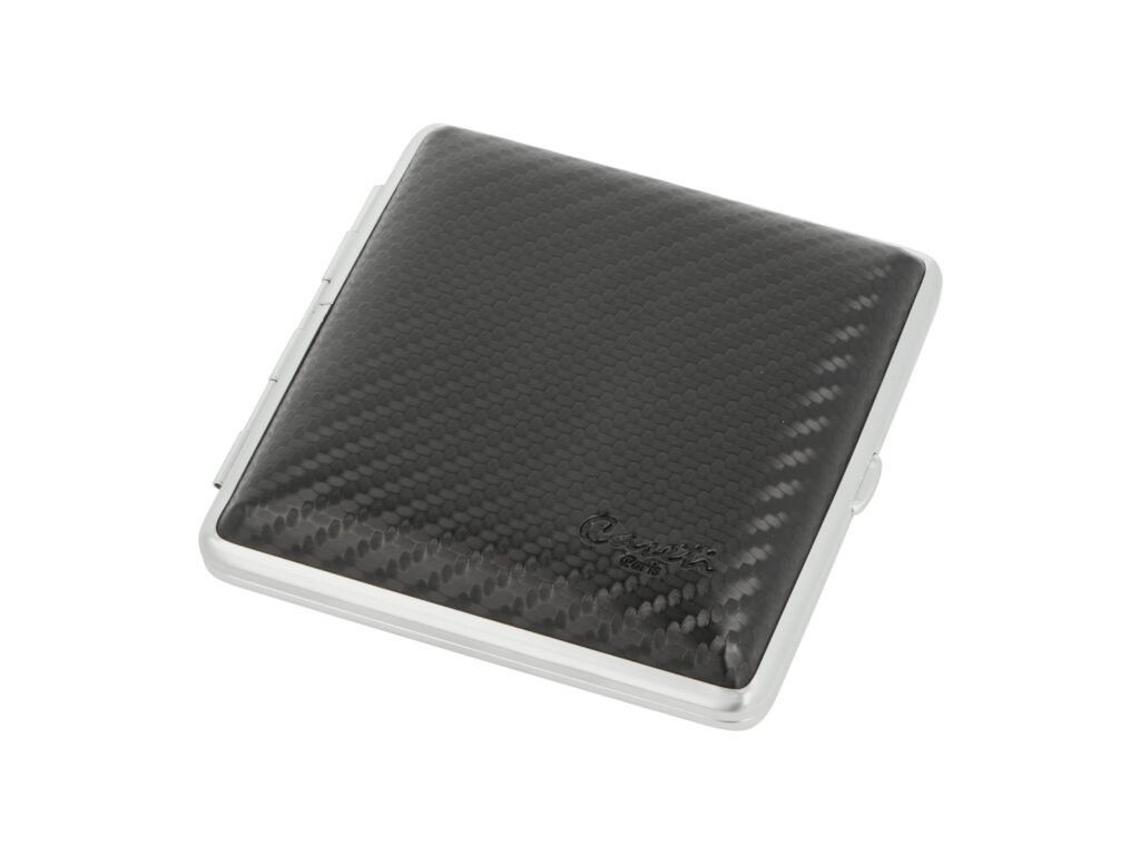 Cigaretové puzdro Caseti v modernom prevedení imitujúcom karbónové vlákna. Povrch tabatierky s jemným vzorom je z pravej kože. Cigarety v tabatierke istí osvedčený a jednoduchý systém dvoch gumičiek.