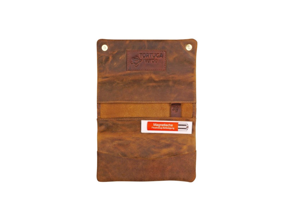 Všetky puzdrá Tortuga Verde sú vyrobené z pravej kože, robustnej a odolnej suroviny, vďaka ktorej je puzdro nadčasovým výrobkom. Okrem oddelenia na tabak je vnútri aj priestor pre cigaretové papieriky a filtre. Do puzdra je všitý magnet, ktorý následne drží zapaľovač na svojom mieste.