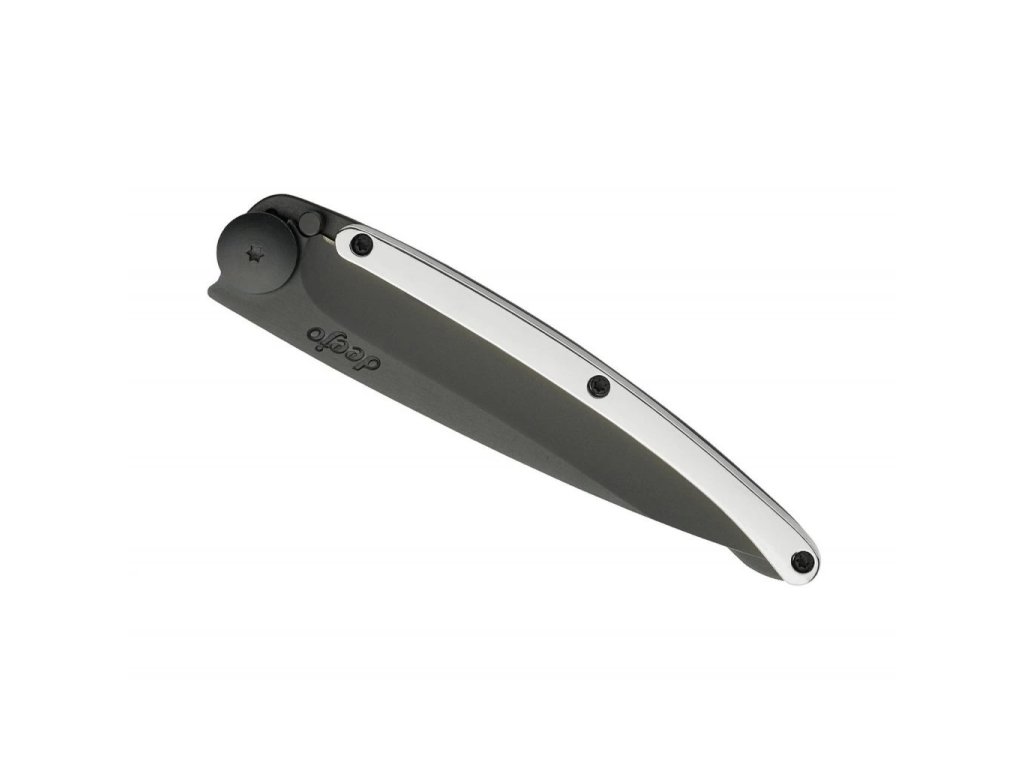 Vreckový nôž Deejo s pokovaním 9k bieleho zlata-paládia. Nôž má na zadnej strane klip na opasok a bezpečnostnú poistku čepele typu liner - lock. Nože Deejo sú dodávané v magnetickej darčekovej krabičke.