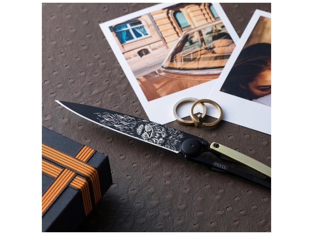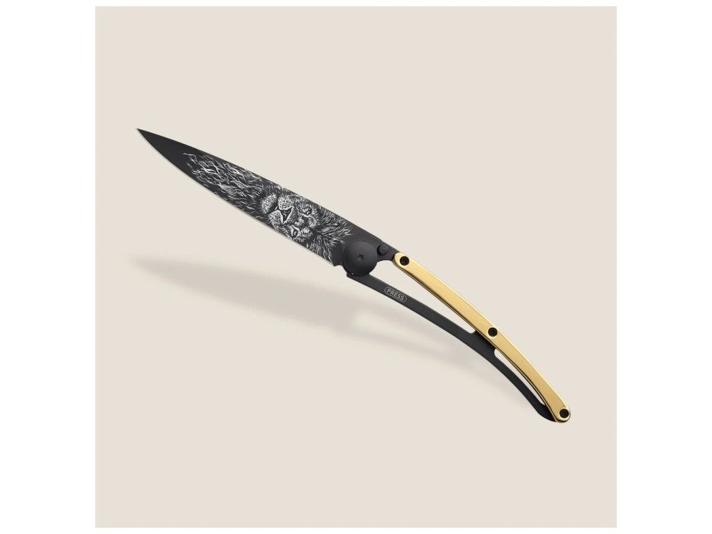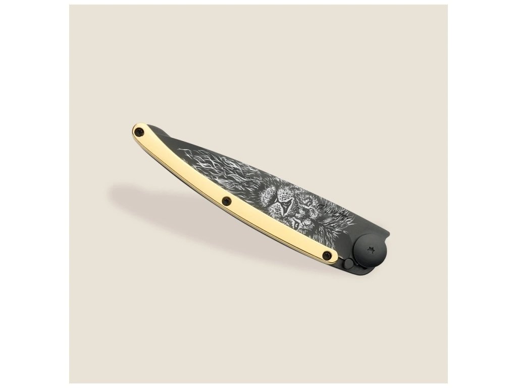 Luxusný vreckový nôž Deejo GOLD Tattoo black 37g 23kt yellow gold Lion