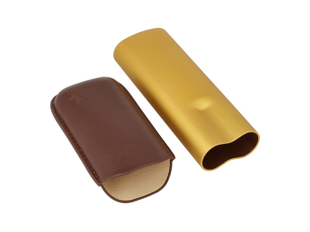 Elegantná etue na dve cigary Angelo Alu je štýlové puzdro pre bezpečné prenášanie vašich obľúbených cigár. Koženkový obal v tmavohnedej farbe s matným povrchom dopĺňa kovový úložný priestor z kvalitného eloxovaného hliníka v zlatom pololesklom prevedení. Embosované logo Angelo a precízne prešívanie dodávajú puzdru luxusný vzhľad.
