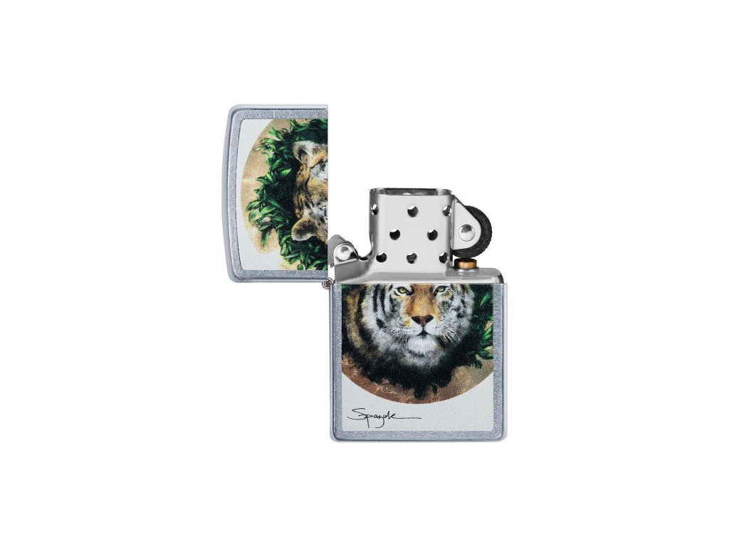Steven Spazuk, známy ako Ohnivý umelec, vytvára podmanivo krásne obrazy pomocou svojho majstrovstva a vynálezu "techniky fumáže", pri ktorej sa upúšťa od tradičných nástrojov, ako sú štetce, a uprednostňuje maľbu ohňom. Keď na plátno priloží plameň, vytvorí sa vzor sadzí, ktorý potom retušuje netradičnými nástrojmi, ako sú pierka a škrabky, aby vzniklo jeho hyperrealistické, ale zároveň snové umenie. Tento model predstavuje výrazného sibírskeho tigra, farebne vyobrazeného na zapaľovači Street Chrome™.