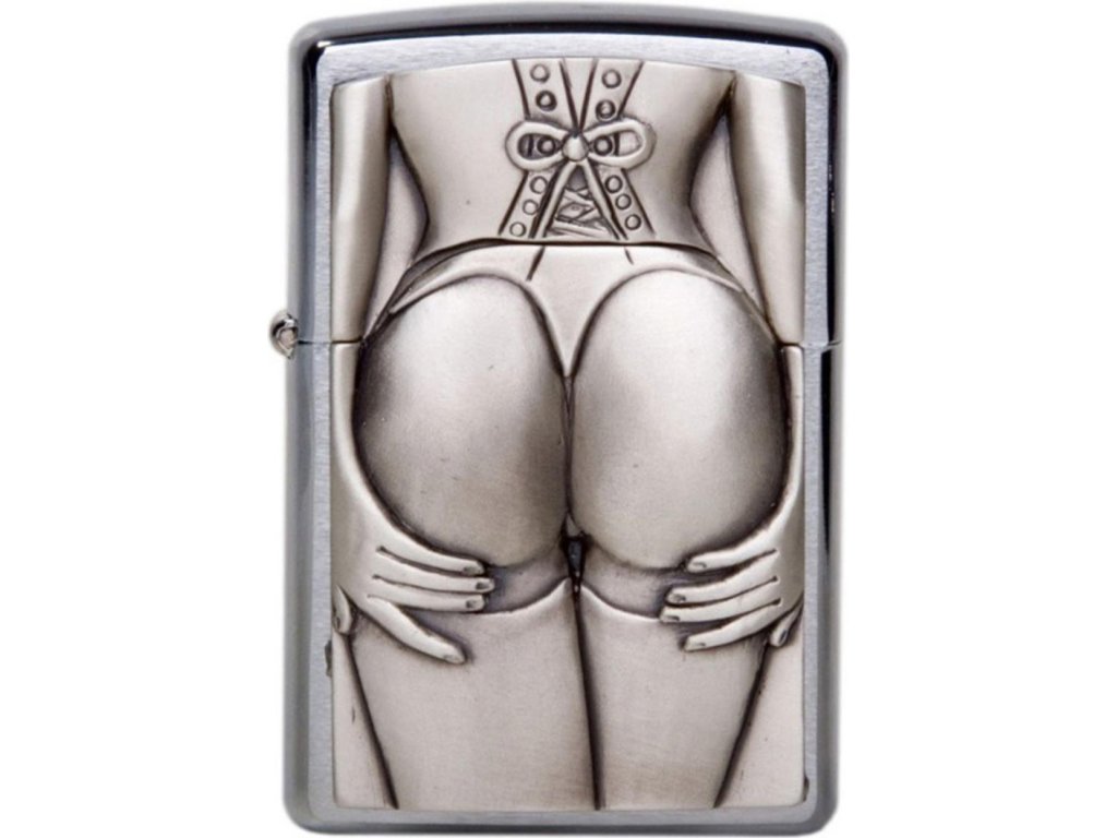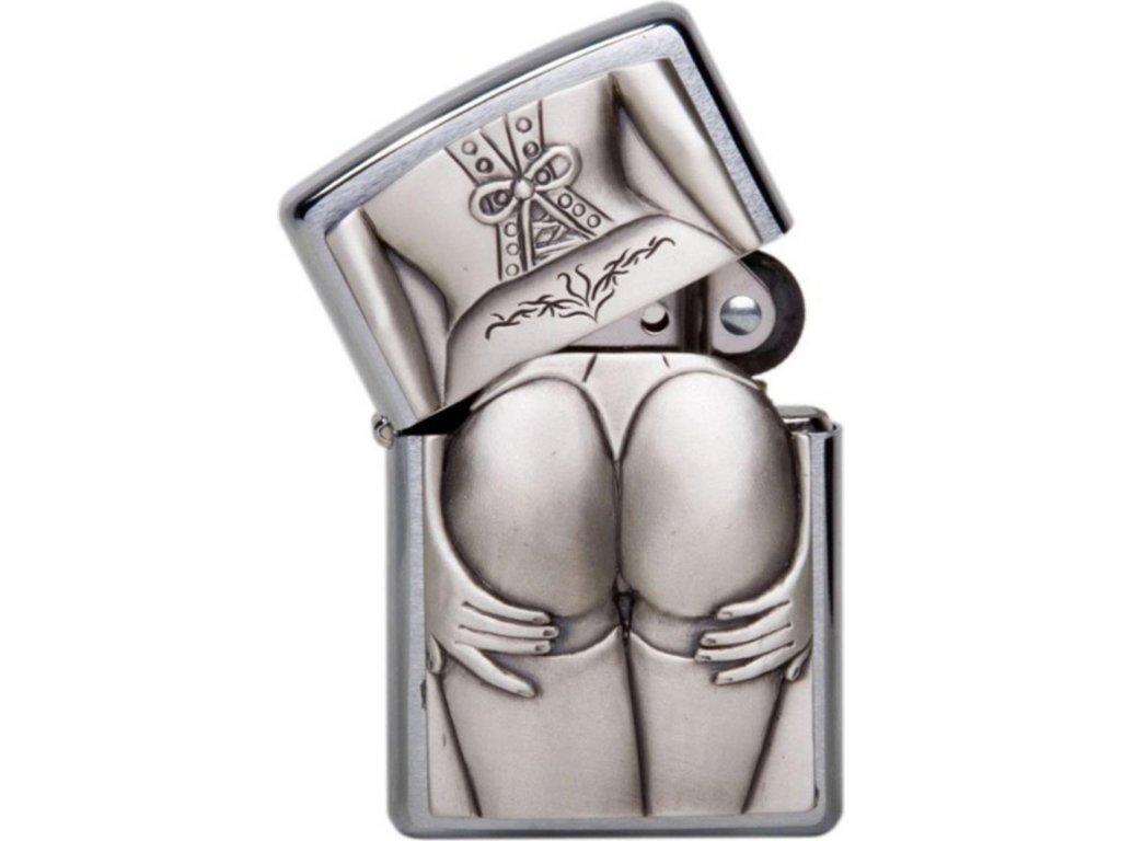 Zippo zapaľovač s emblémom: Dámske nohy s podväzkami. Jedná sa o tzv. "Trick Zippo" kedy sa po otvorení viečka odhalí inak skrytý detail.