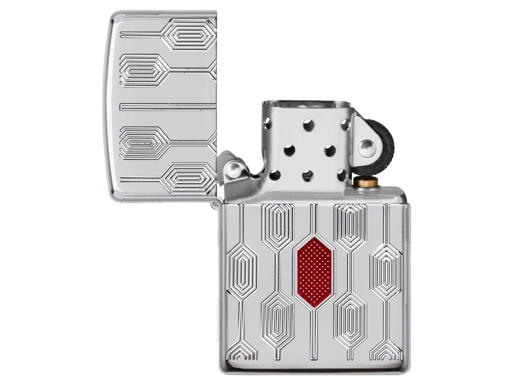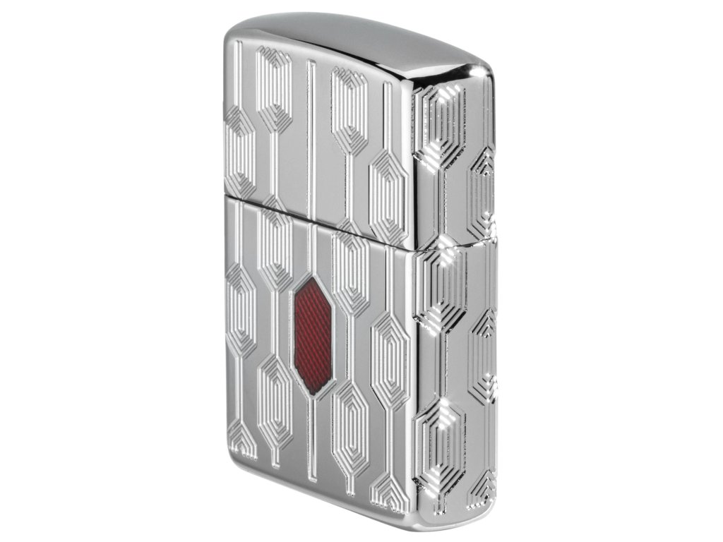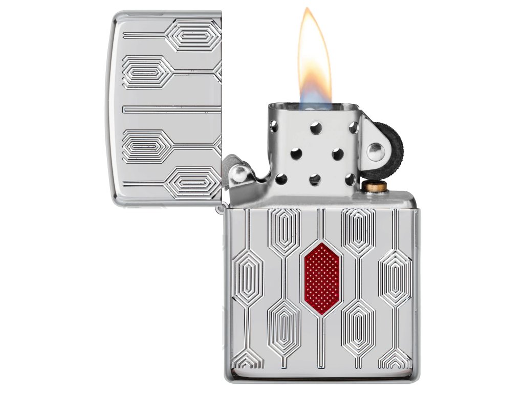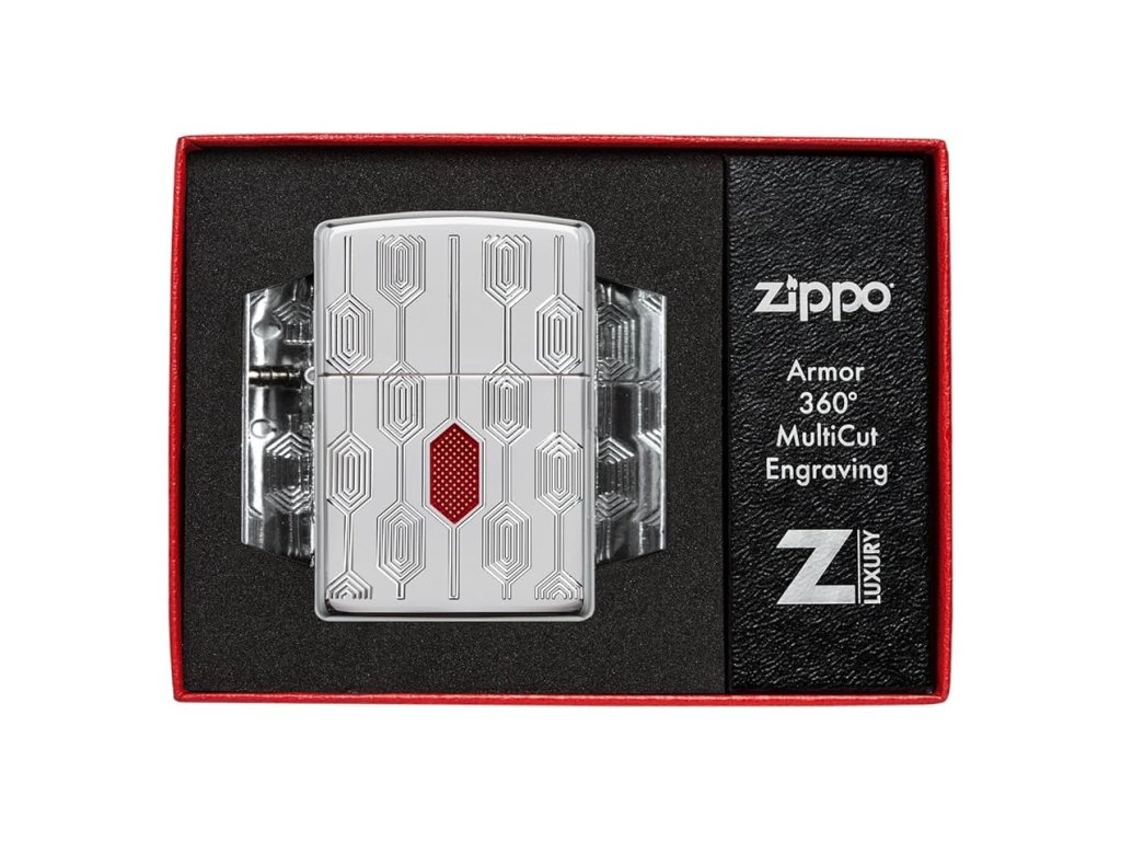 - Motív: hlboké a výrazné mechanické rytie na všetkých zvislých stranách Zippo zapaľovača + zdobenie červeným epoxidom v strede prednej strany
