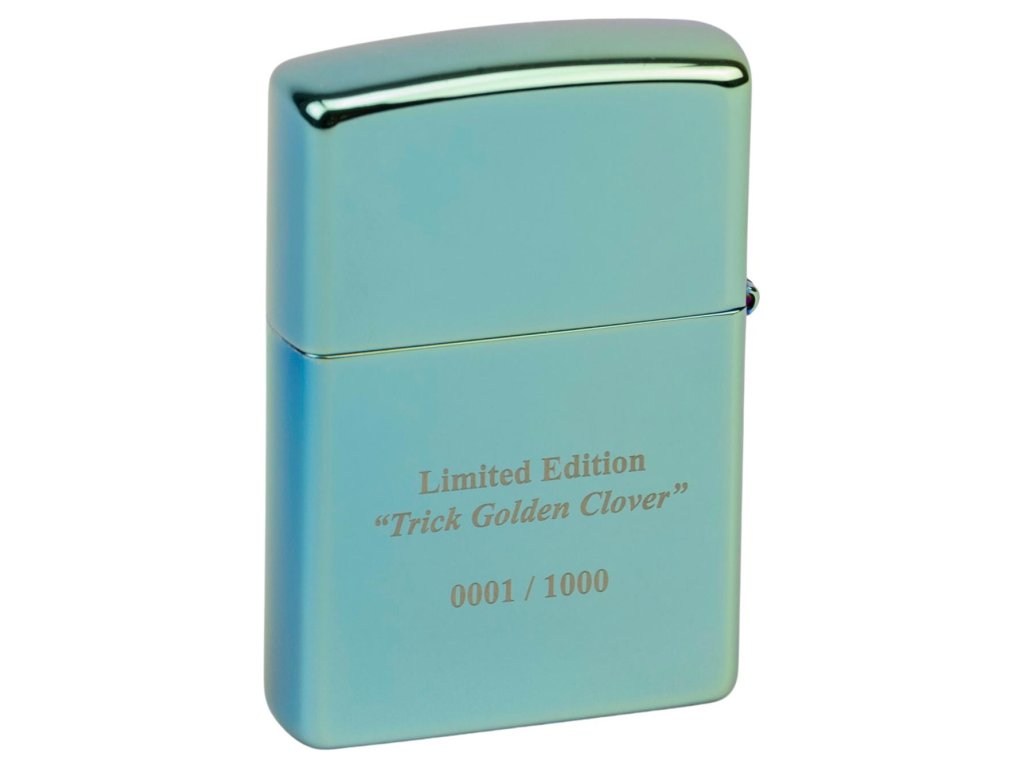 Exkluzívny zapaľovač Zippo Trick Golden Clover / Leave (251760) z limitovanej edície o iba 1 000 kusoch. Tento model zaujme tyrkysovým povrchom Teal Polished v kombinácii so zlatou plaketou so symbolom štvorlístka – symbolom šťastia a prosperity.