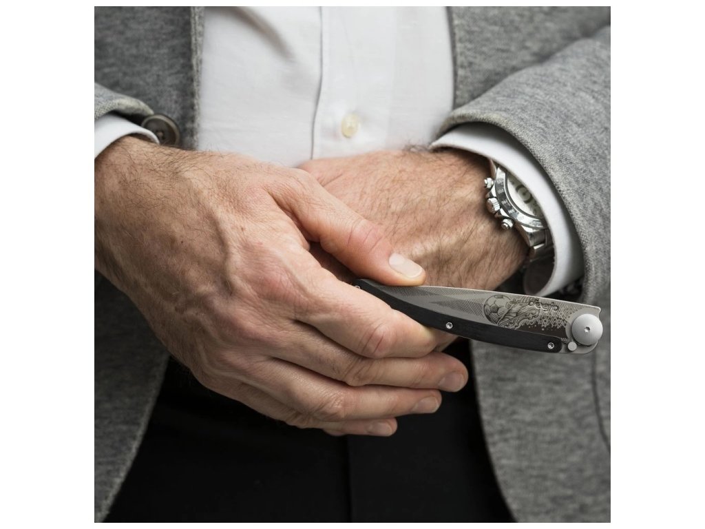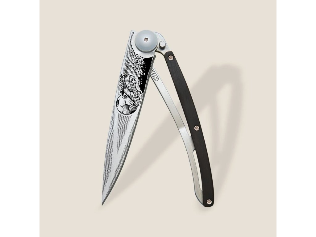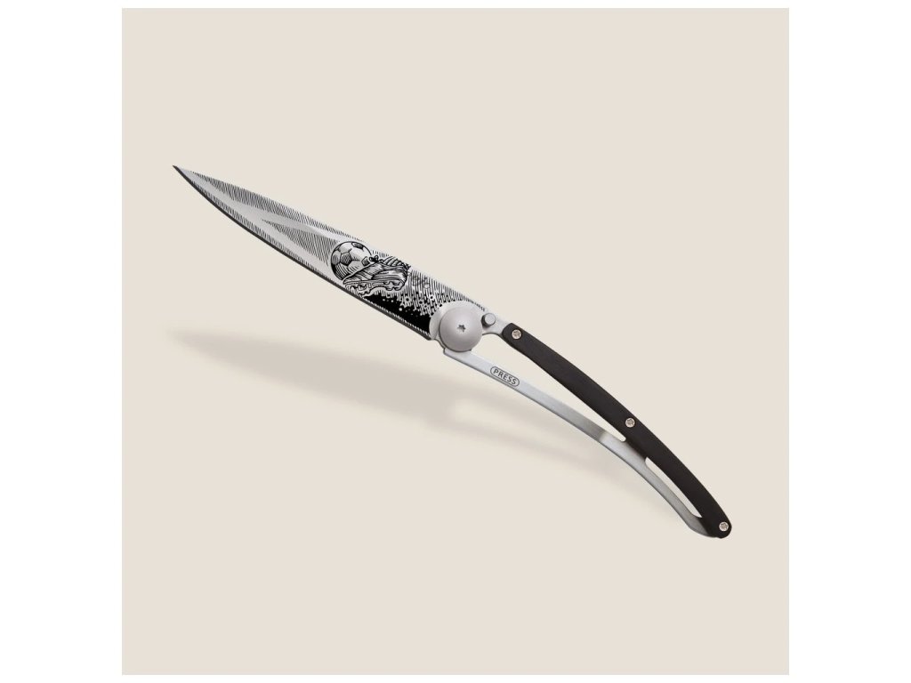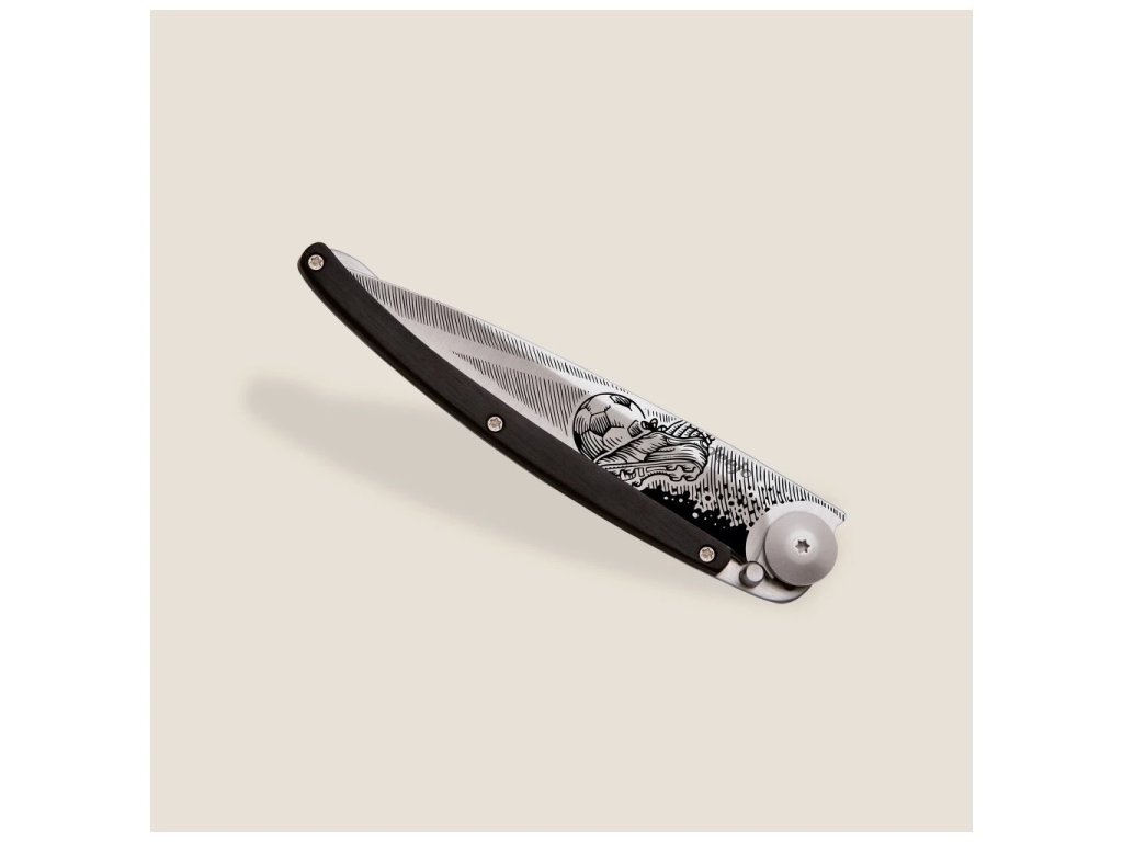 Deejo Goal je ideálnym spoločníkom pre fanúšikov futbalu a milovníkov štýlových vreckových nožov. Tento ultraľahký nôž kombinuje prvotriednu funkčnosť a originálny dizajn s motívom futbalovej lopty gravírovaným laserom na čepeli.
