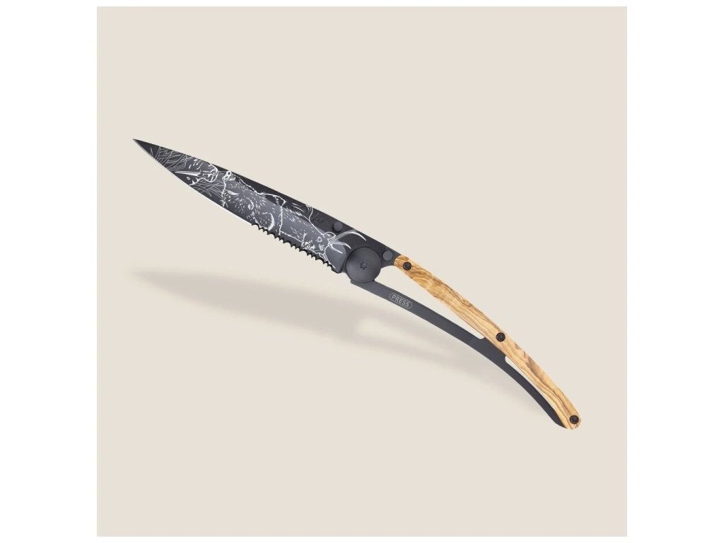 Čepeľ z ušľachtilej nehrdzavejúcej ocele Z40C13 s čiernym titánovým povrchom a zúbkovaným ostrím ponúka vynikajúcu odolnosť a výkon. Rúčka z olivového dreva vyniká svojou unikátnou kresbou – každý kus je originál.