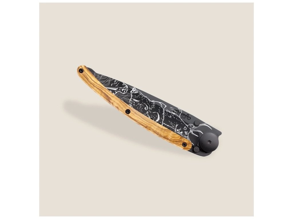 Vreckový nôž Deejo Tattoo Serration black 37g Hunting scene olive wood