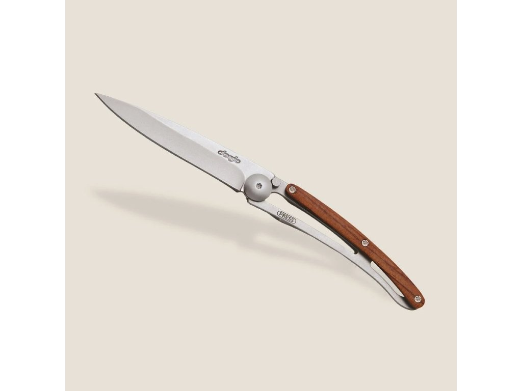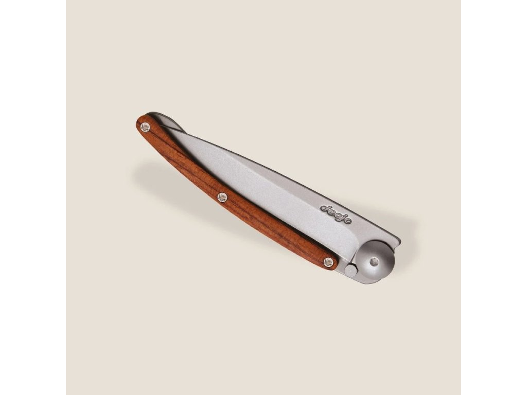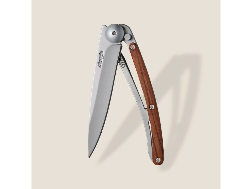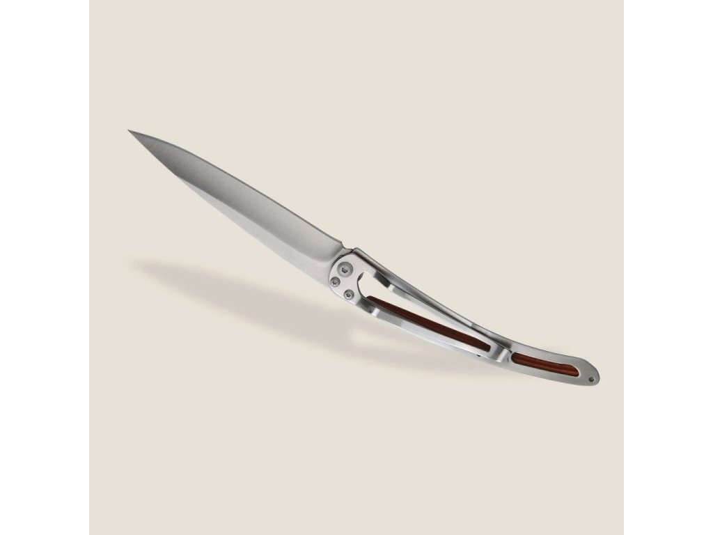 Ultraľahký vreckový nôž spája eleganciu s funkčnosťou. Jeho čepeľ z nehrdzavejúcej ocele Z40C13 od Aubert & Duval so svetlou titánovou úpravou zaisťuje vysokú odolnosť a precíznu ostrosť. Exotická střenka z tvrdého dreva coralwood sa pýši jedinečným načervenalým odtieňom, ktorý prirodzene vzniká pôsobením svetla. Liner lock poistka a spona na opasok garantujú bezpečné nosenie a jednoduché použitie. Ideálne pre každodenné nosenie aj outdoorové aktivity.
