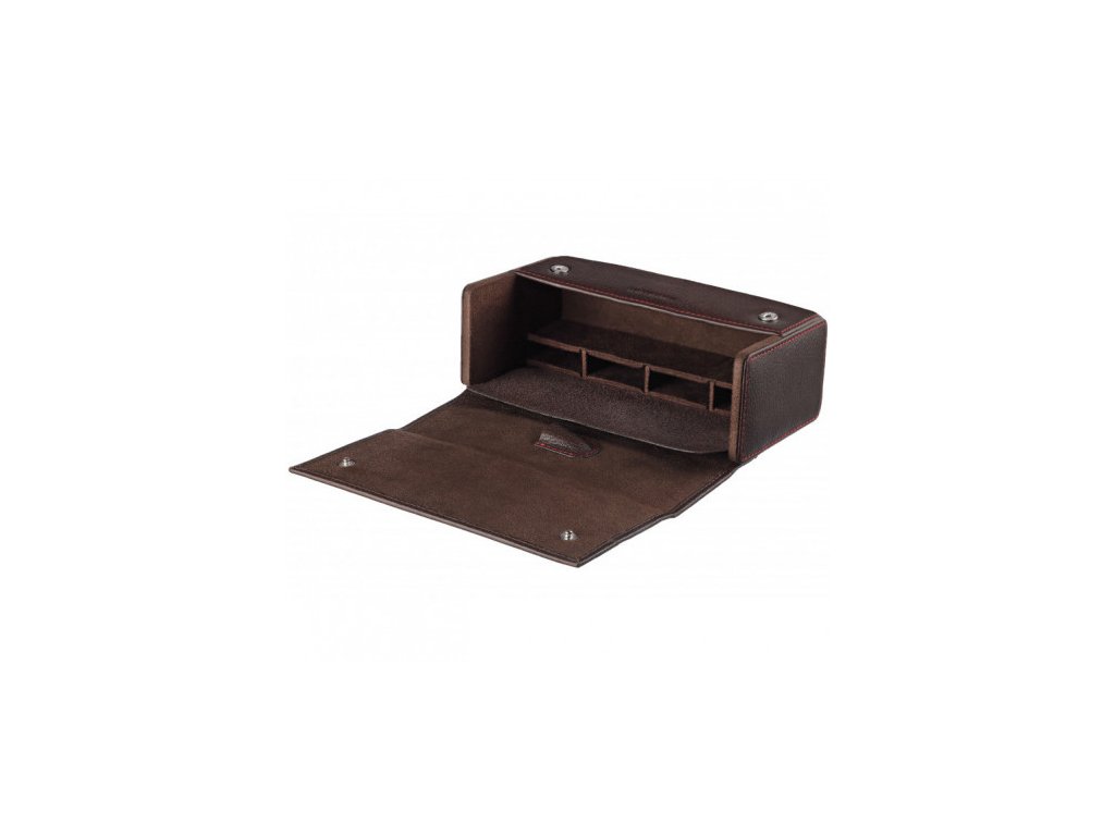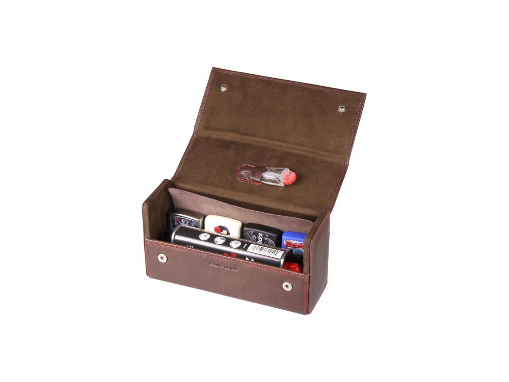 Cestovné puzdro na Zippo: Praktické a luxusné puzdro vyrobené z kvalitnej kože, ktoré pojme štyri kusy benzínových zapaľovačov Zippo, benzín a kamienky Zippo.