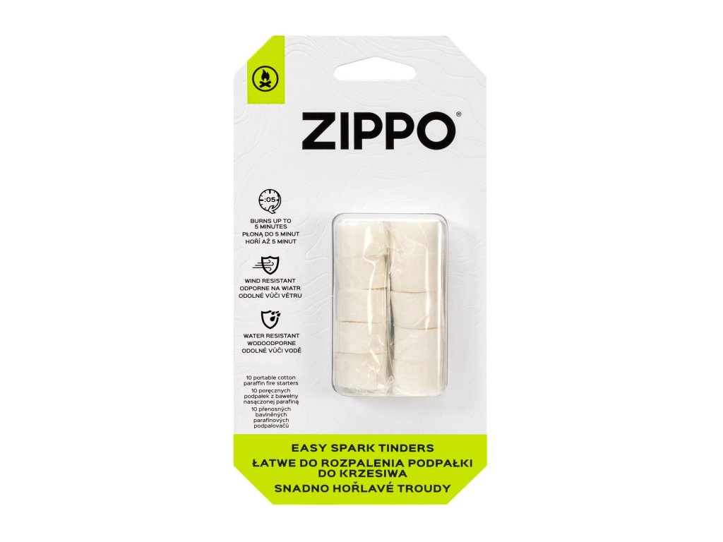 Ľahké a vodeodolné Zippo trúdy: 10 kusov z prírodných bavlnených vlákien, každý horí až 5 minút. Ideálne na zakladanie ohňa v najnáročnejších podmienkach, s priechodným otvorom pre jednoduché použitie.
