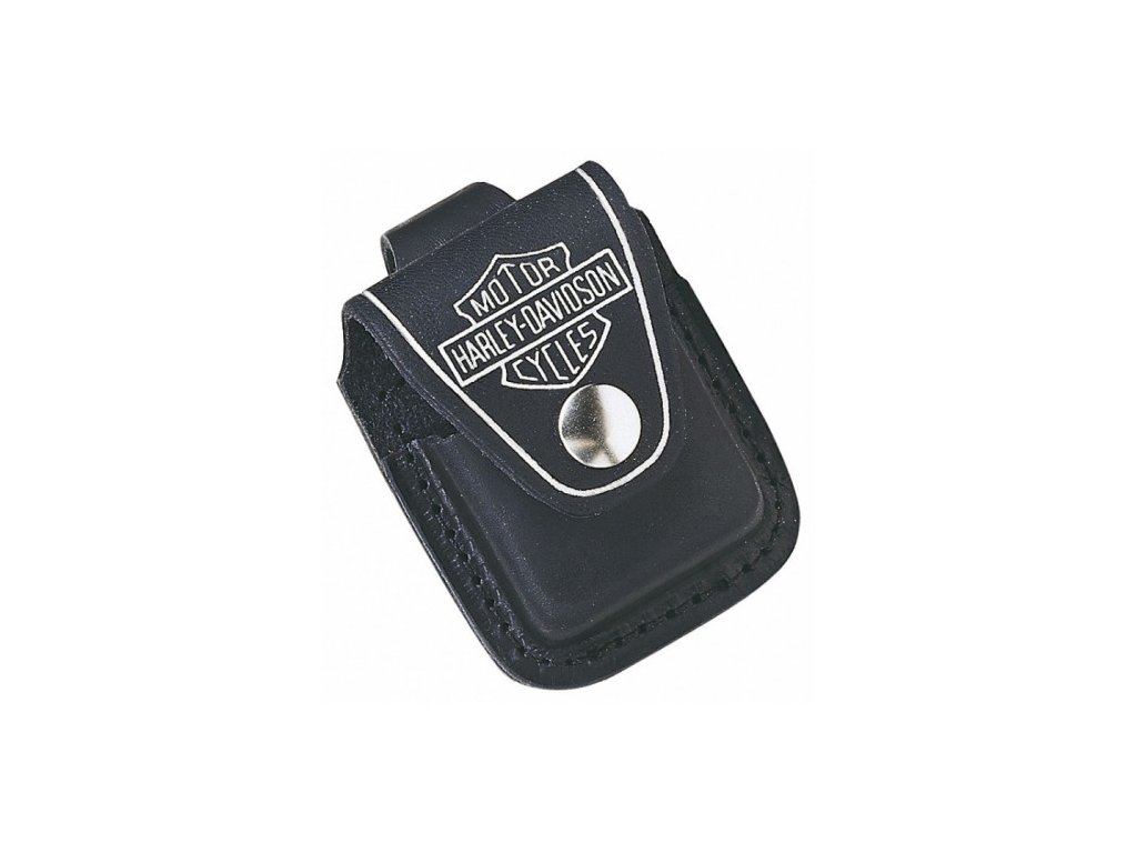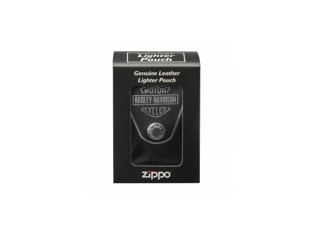 Kožené puzdro na Zippo zapaľovač s logom Harley-Davidson na chlopni. Puzdro má na zadnej strane pútko pre bezpečné pripevnenie za opasok.