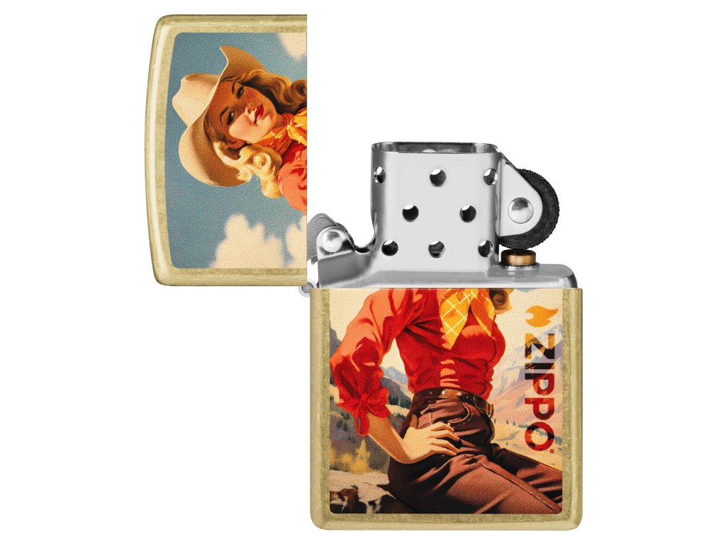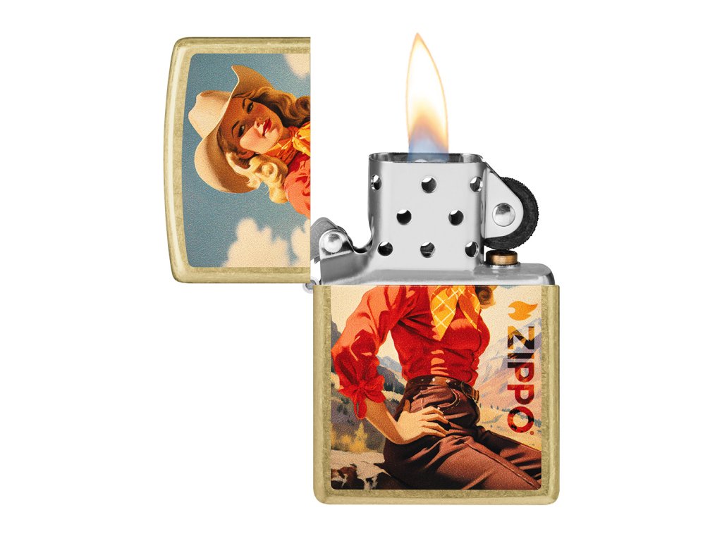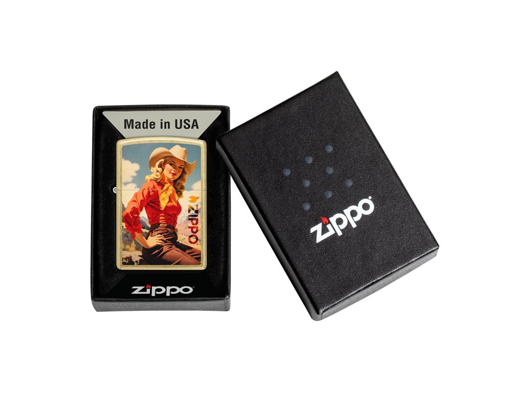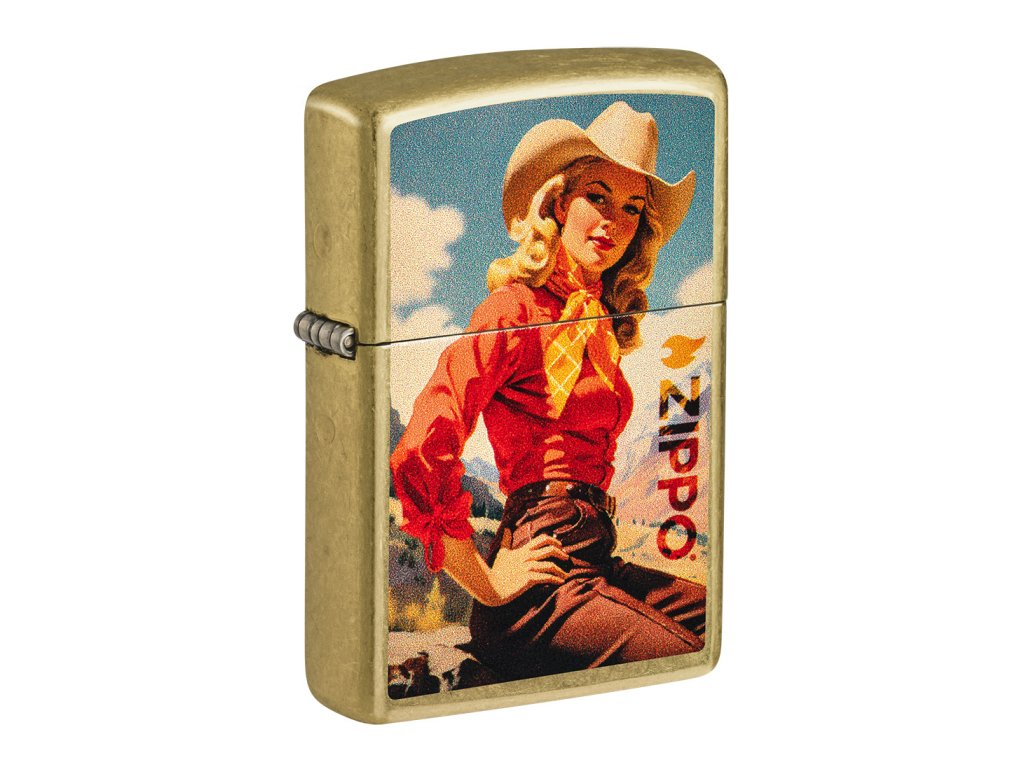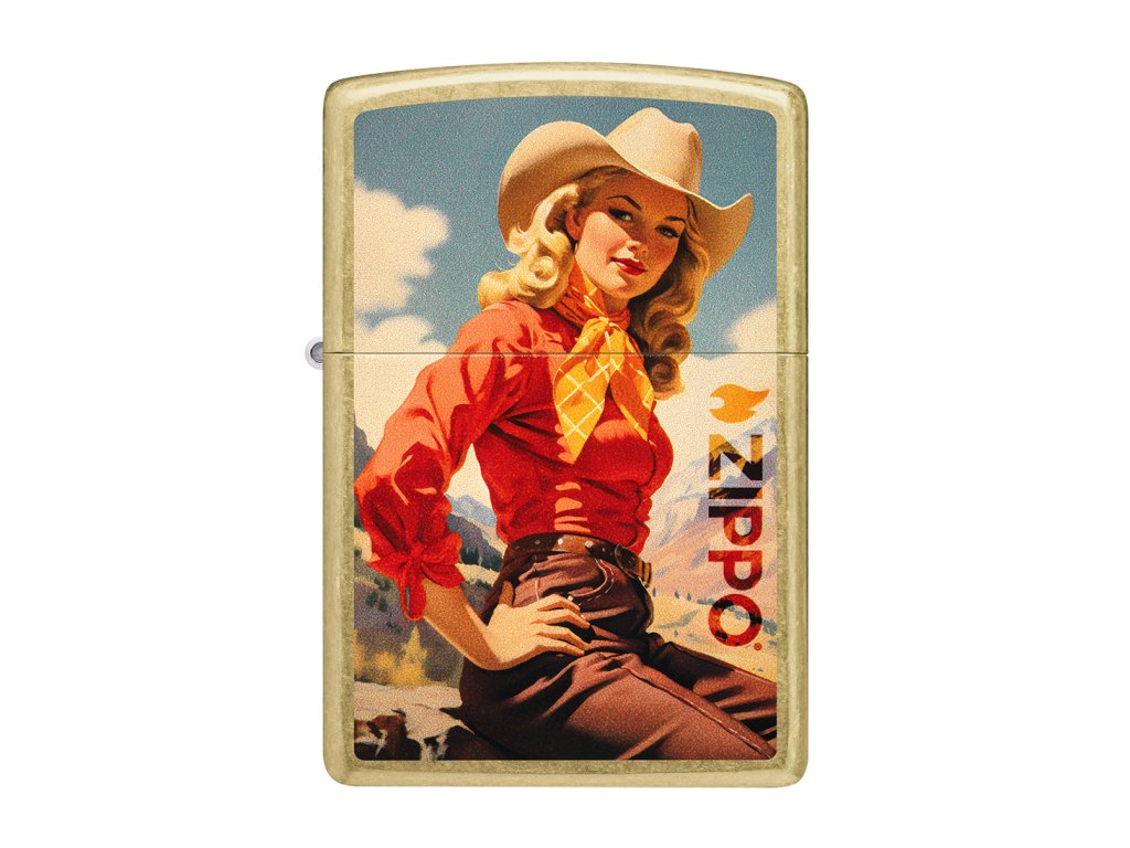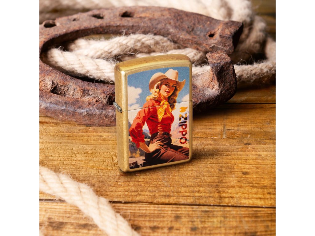 Zippo Street Brass s westernovým motívom rančerky vo farebnej tlači. Odolné voči vetru, ikonické "klik", plniteľný dizajn s doživotnou zárukou. Dodávané v darčekovej krabičke.
