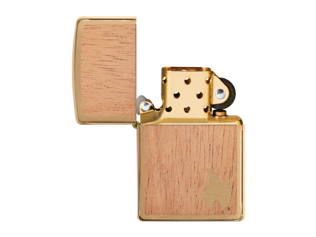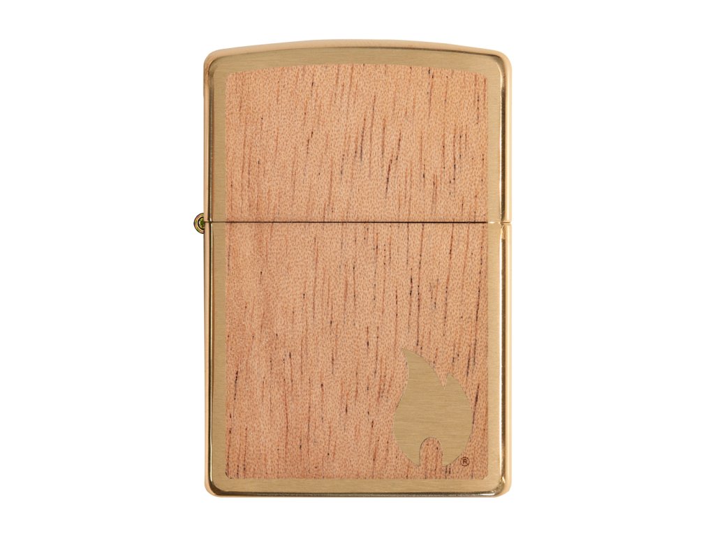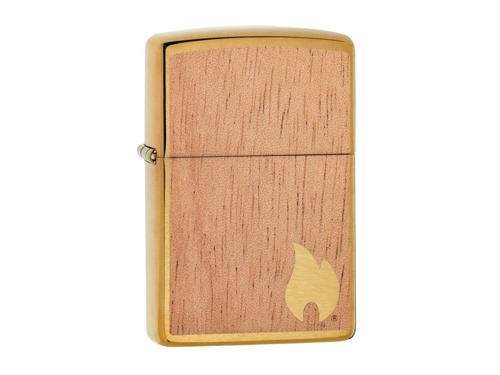 • Motív: Plastický drevený emblém na prednej aj zadnej strane je z pravého mahagónového dreva - na prednej strane je v drevenom plátku odgravírovaný plamienok Zippo a tým je odhalený mosadzný povrch zapaľovača