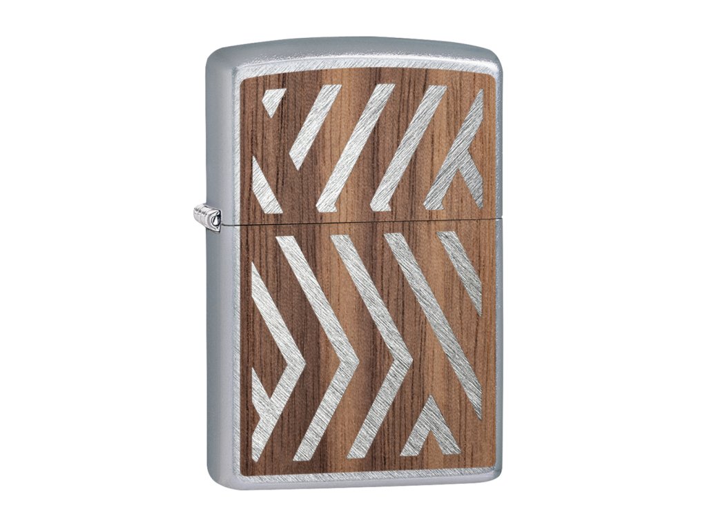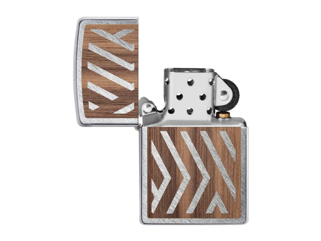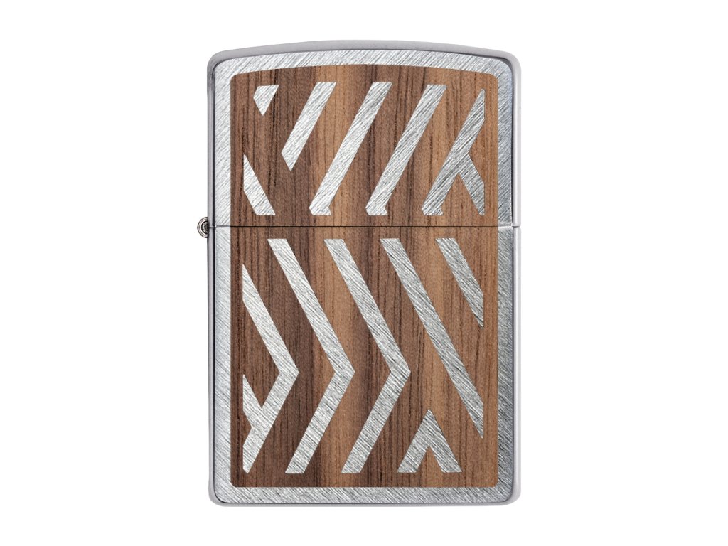 - Motív: emblém na prednej aj zadnej strane je z pravého orechového dreva - na prednej strane sú v drevenom plátku laserom odgravírované geometrické obrazce, ktoré odhaľujú pochrómovaný povrch zapaľovača