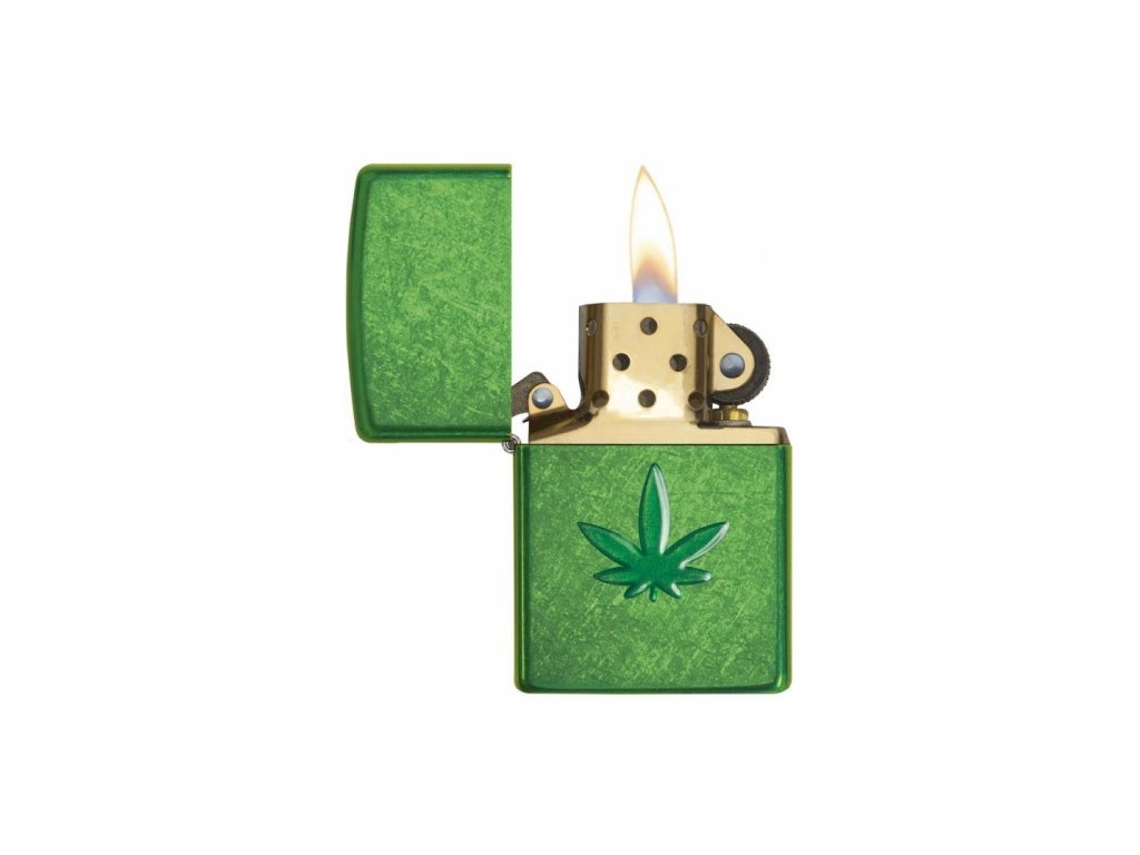Zapalovač Zippo s vylisovaným motivem listu konopí na jasně zeleném povrchu Meadow. Klasický benzínový zapalovač Zippo s doživotní zárukou.