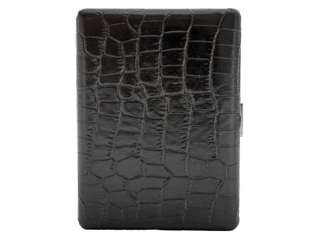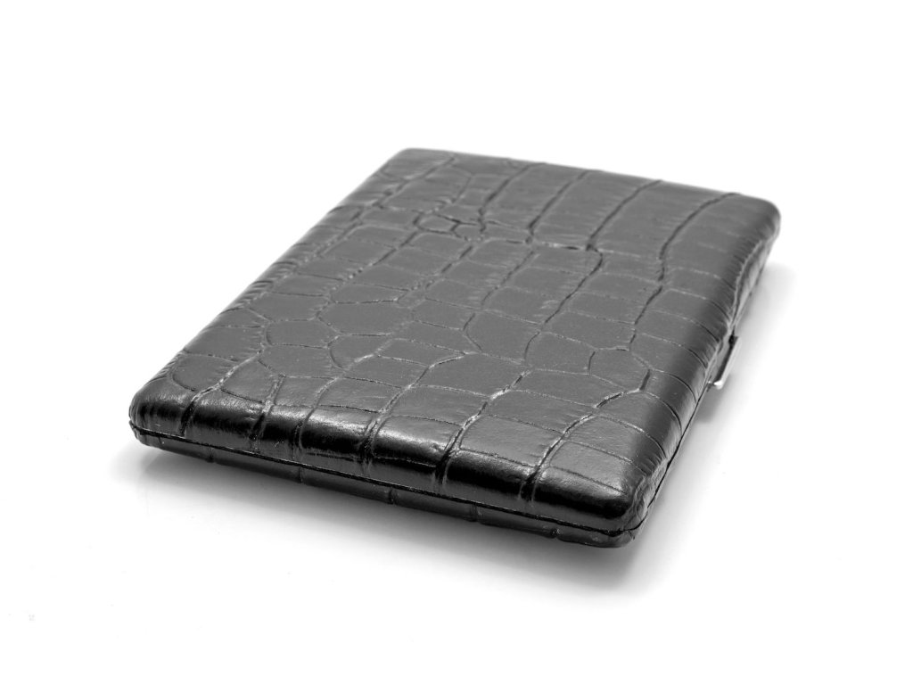 Vnější část je potažena kvalitní hovězí kůží v černém provedení s krokodýlí ražbou, která dodává pouzdru luxusní vzhled a příjemný úchop. Konstrukce je tvořena mosazí zušlechtěnou cínovou slitinou, což zajišťuje vysokou odolnost a dlouhou životnost.