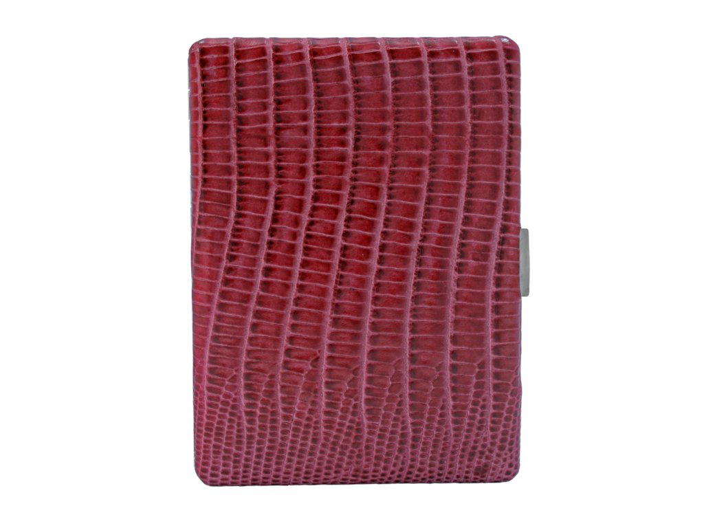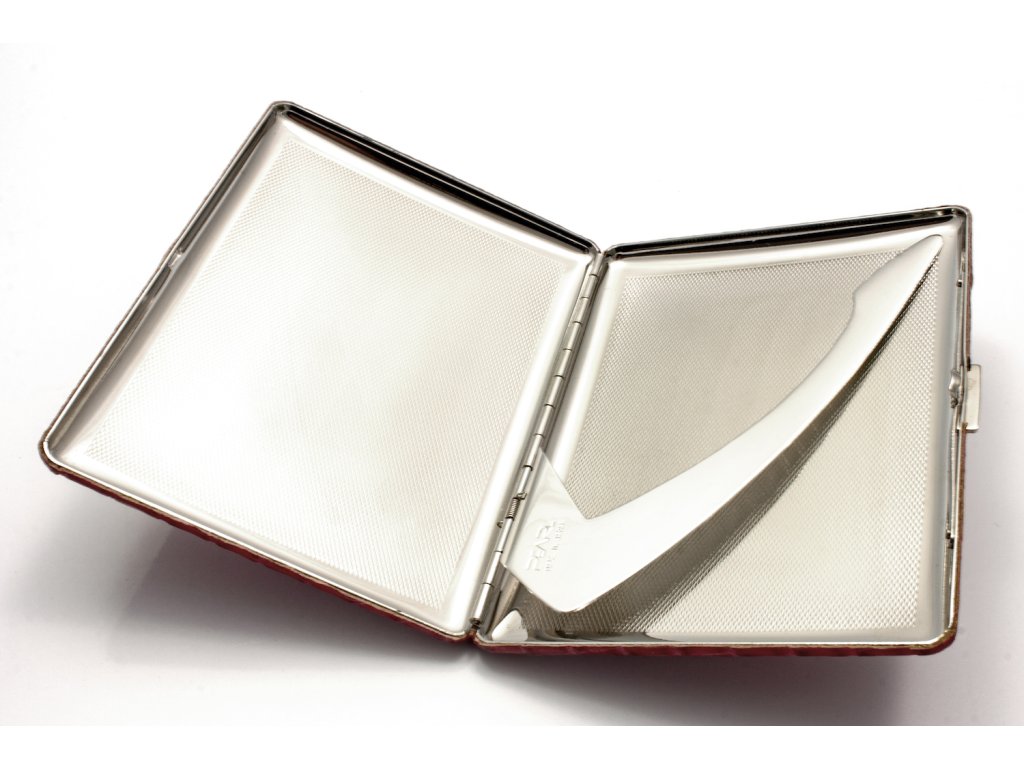 Základem tabatěrky je robustní mosazná konstrukce zušlechtěná cínovou slitinou. Ta dodává pouzdru potřebnou váhu a odolnost, kterou pocítíte při každém doteku. Povrch je potažen prémiovou hovězí kůží v sytě červeném odstínu s hlubokou krokodýlí ražbou, která časem získává unikátní patinu.