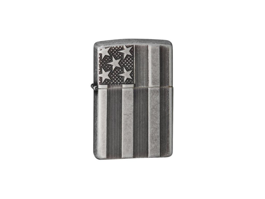 Zippo zapalovač s výraznou rytinou americké vlajky do postříbřeného povrchu Antique Silver. Zapalovač má zesílené stěny schránky - řada Armor.