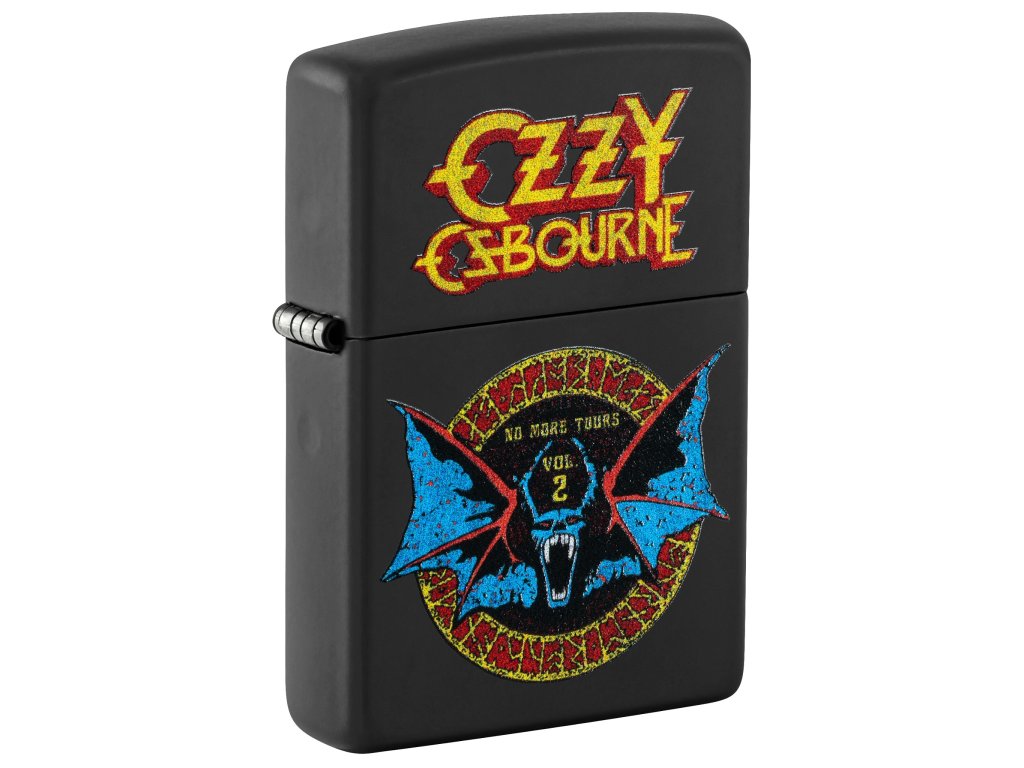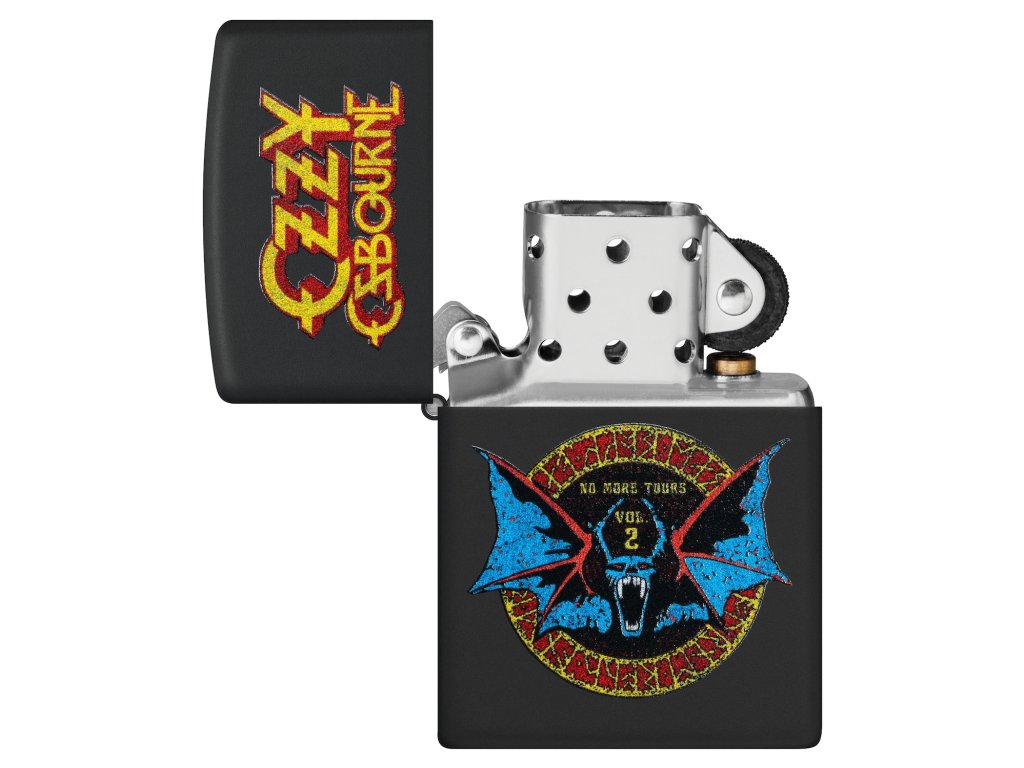 Originální benzínový zapalovač Zippo v matně černém provedení Black Matte s motivem legendárního turné Ozzyho Osbourna. Design využívá technologii barevného potisku Color Image a zobrazuje ikonické logo s motivem netopýra z turné „No More Tours Vol. 2“.