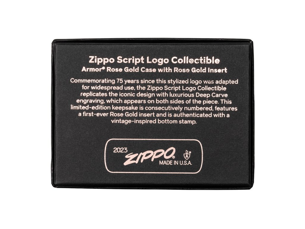Vzdáváme hold 75. výročí od okamžiku, kdy společnost Zippo MFG poprvé uvedla své stylizované "psací" logo Zippo. Limitovaná edice, Zapalovač Zippo Script Logo Collectible, přináší ikonický design tohoto období v exkluzivním provedení. Zapalovač zdobí inovativní technologie hlubokého frézování Deep Carve, která se výrazně projevuje na obou stranách tohoto ohromujícího zapalovače, vybaveného schránkou Armor® s povrchem Rose Gold pro maximální odolnost. Každý kus této luxusní sběratelské edice je sériově číslovaný, disponuje unikátním insertem s povrchovou úpravou Rose Gold a nese zvláštní razítko na spodní ražbě. To vše je prezentováno ve speciální dárkové krabičce, abyste si mohli užívat tuto elegantní památku.