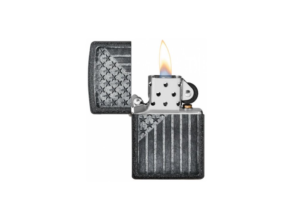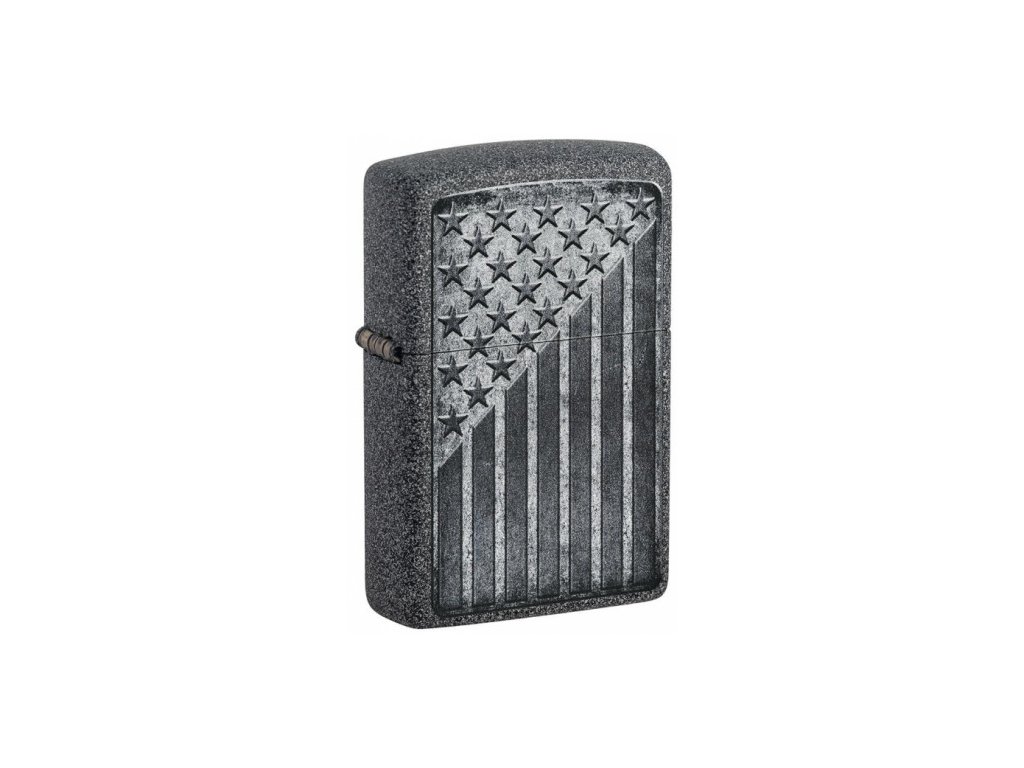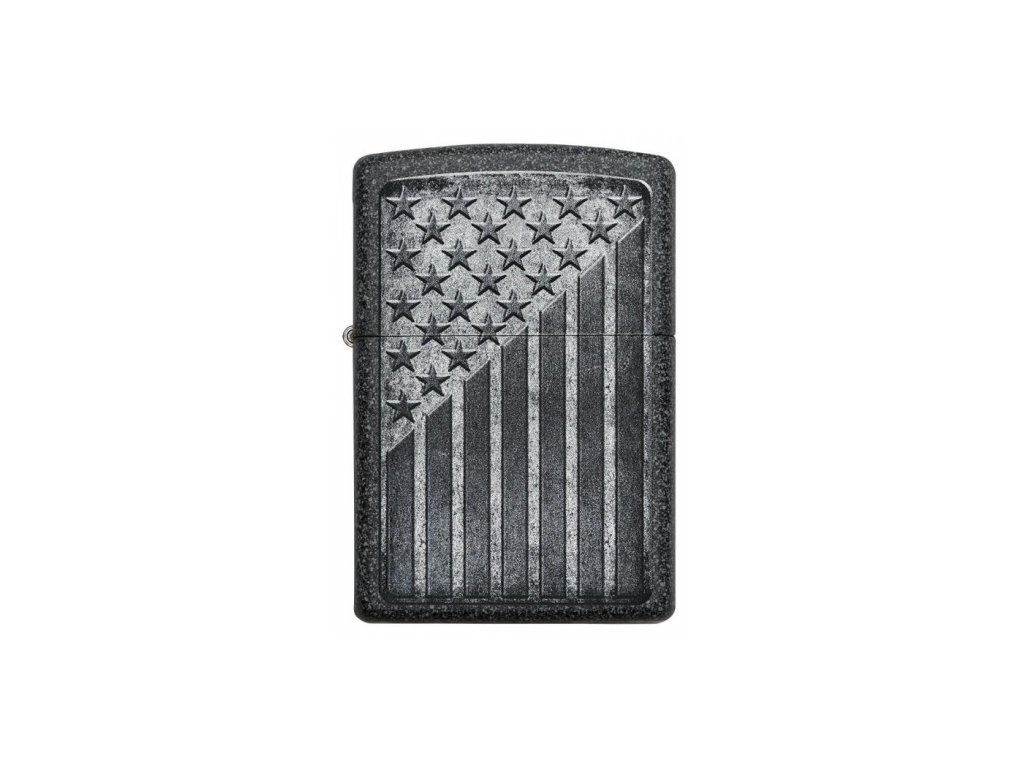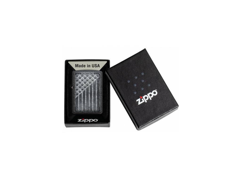 Motiv americké vlajky na povrchu Iron Stone. Originální benzínový zapalovač Zippo. Zapalovač je dodáván v dárkové krabičce.