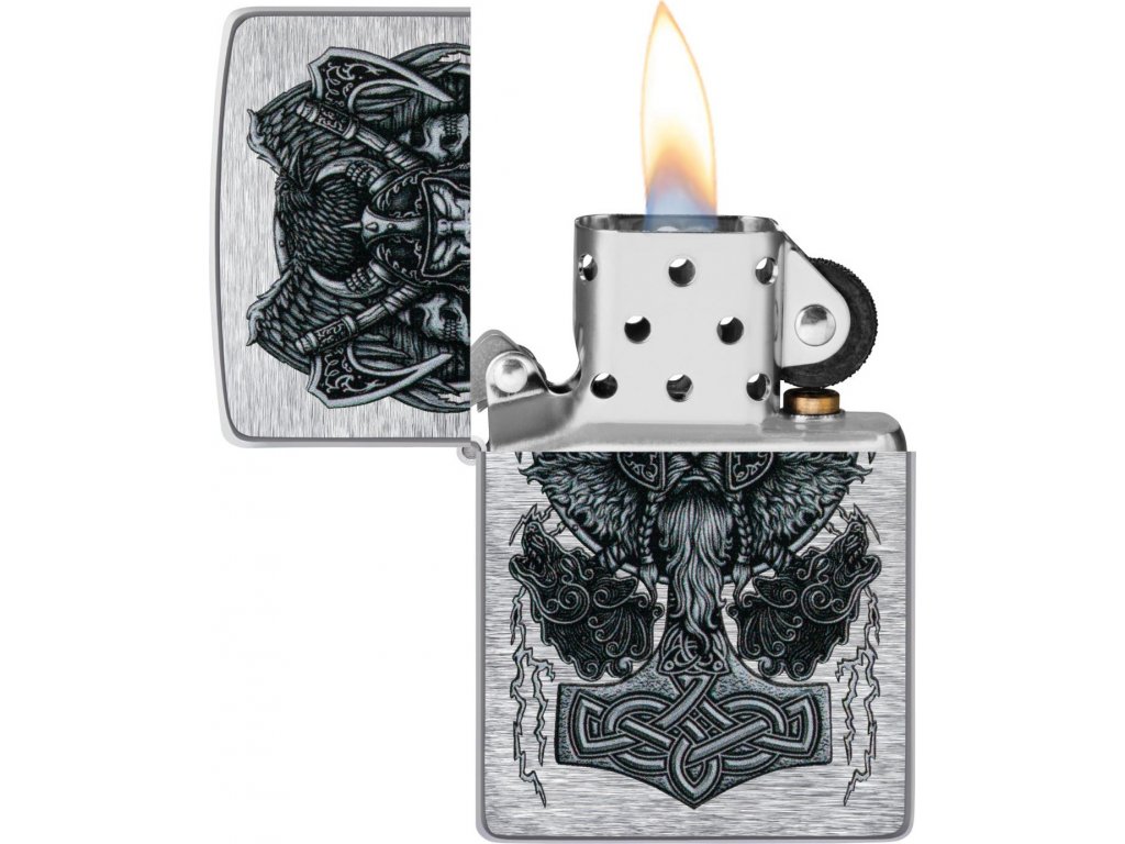 Viking Hammer Zippo 21774: Silný vikingský motiv válečníka a Thórova kladiva. Odolná konstrukce Zippo, krytá doživotní zárukou pro trvalou spolehlivost.