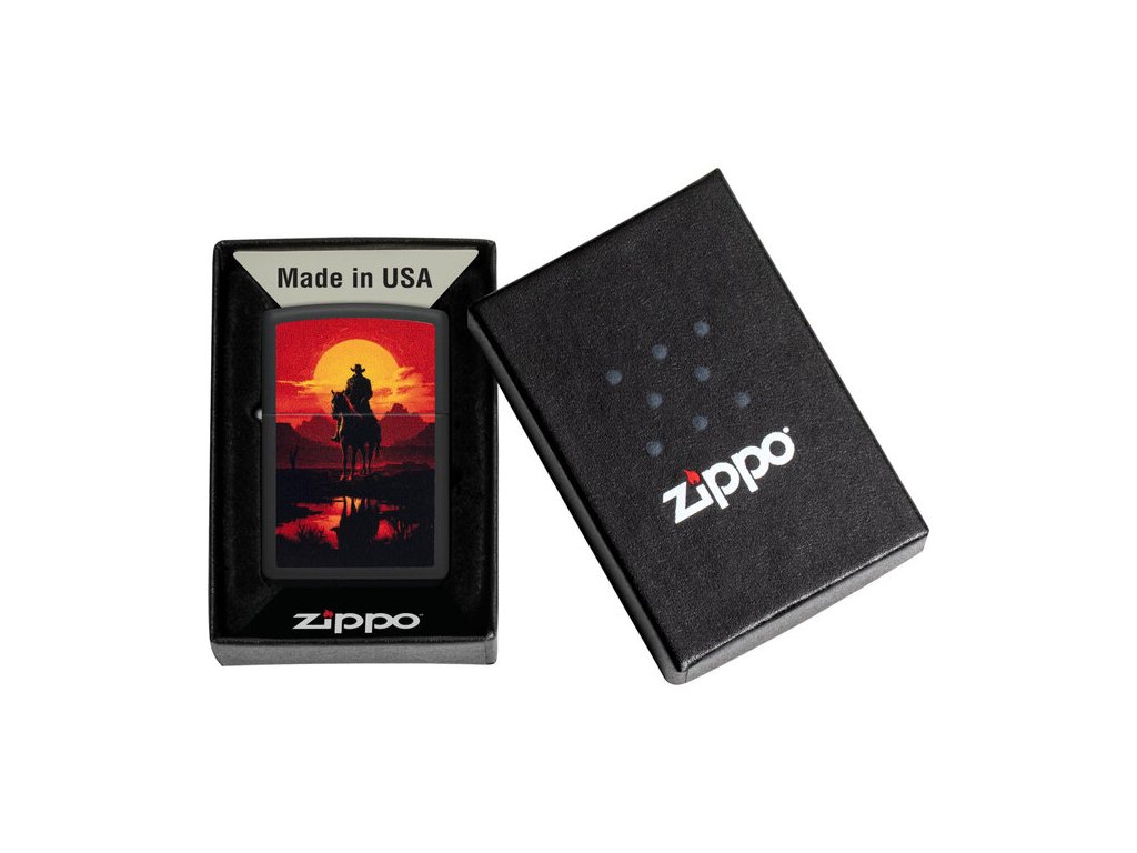 Vypravte se do dob nespoutaného divokého západu s tímto stylovým zapalovačem Zippo Western Scene. Na elegantním podkladu v úpravě Black Matte (černý mat) vyniká detailní barevný potisk nanesený pokročilou technikou Photo Image. Scenérie zobrazuje osamělého cowboye projíždějícího ikonickou krajinou na pozadí hřejivého západu slunce.
